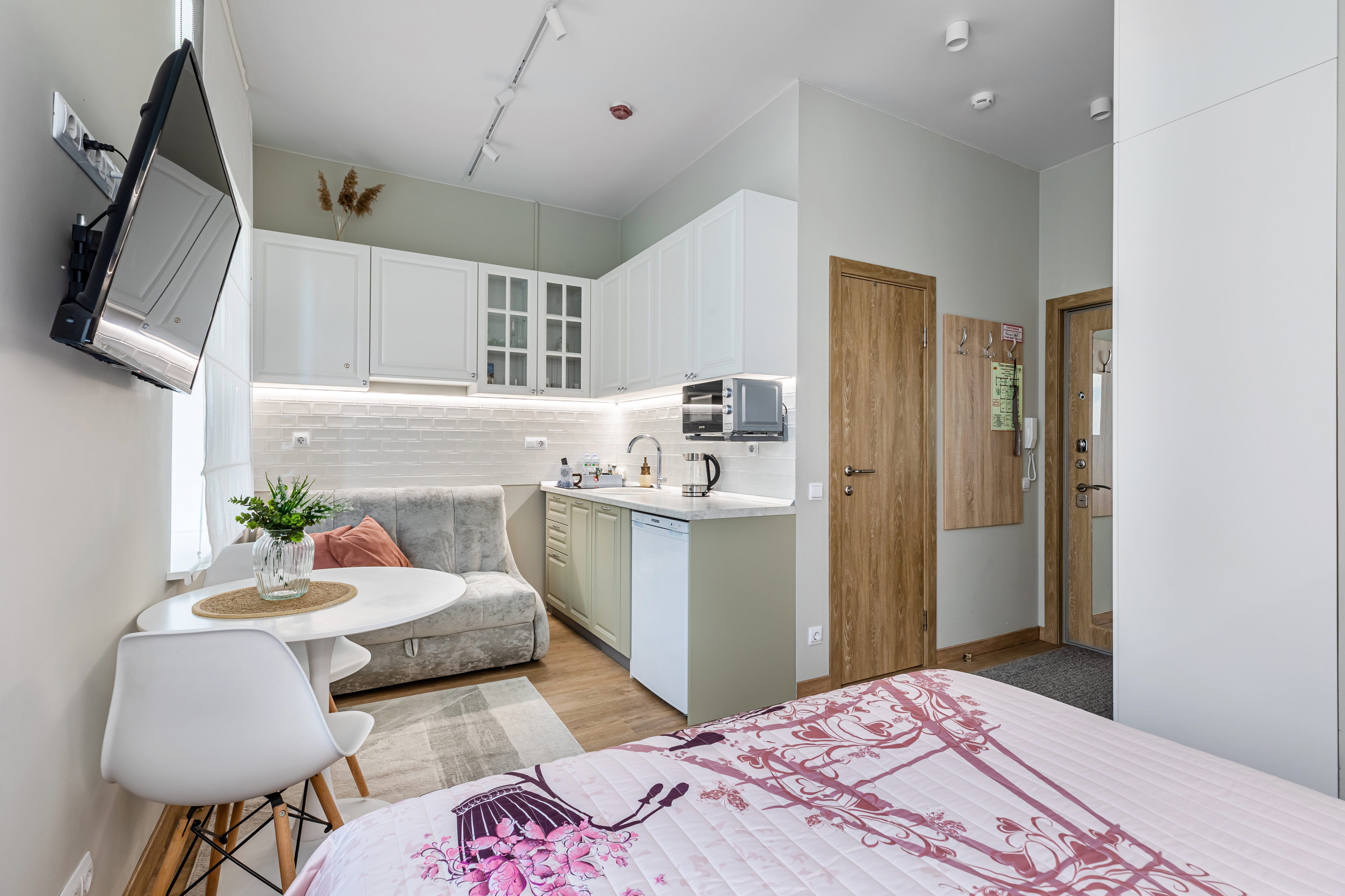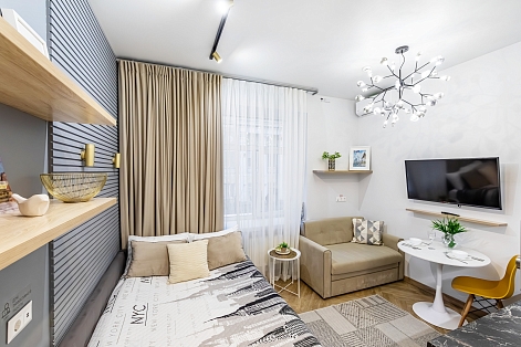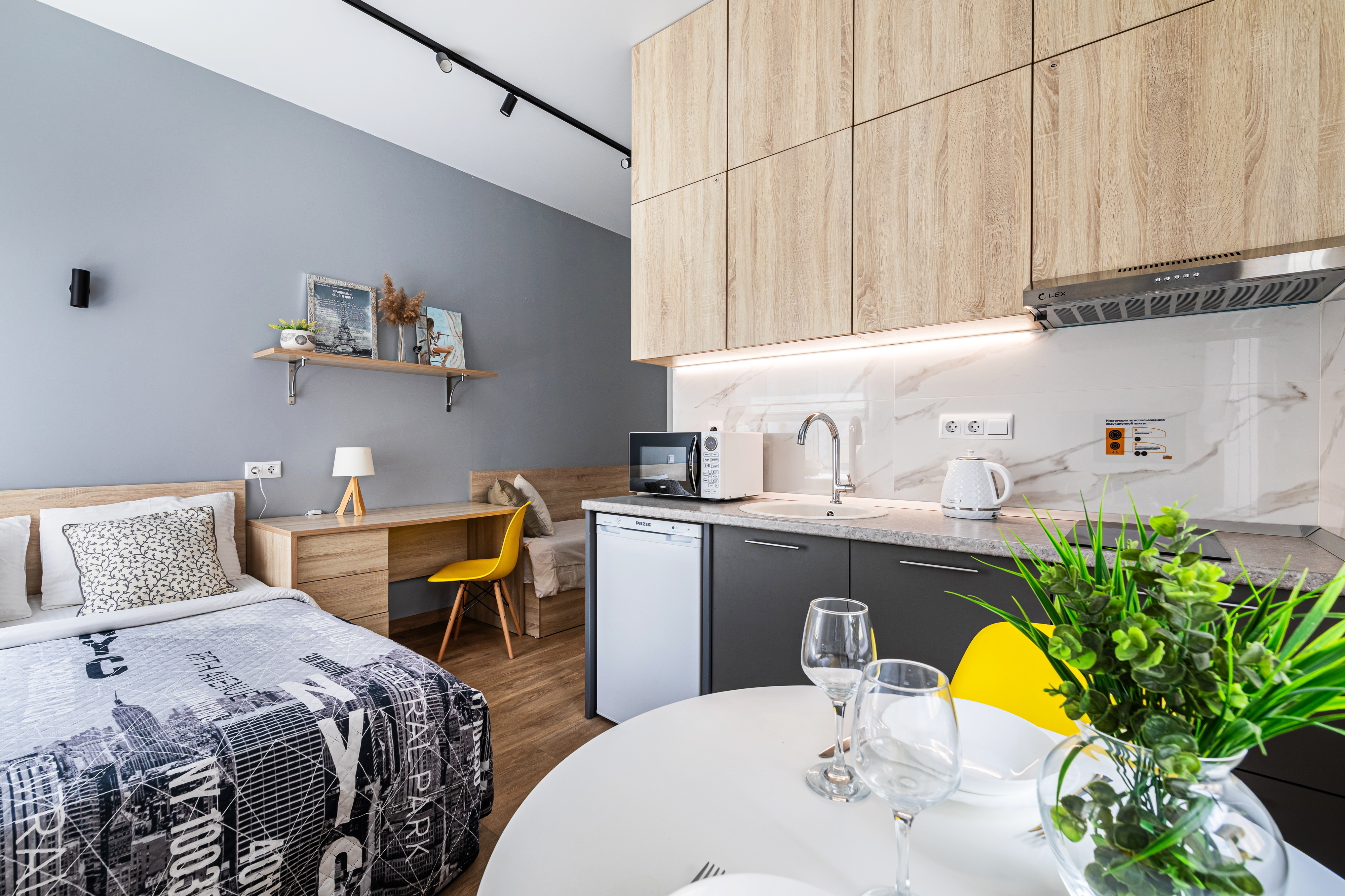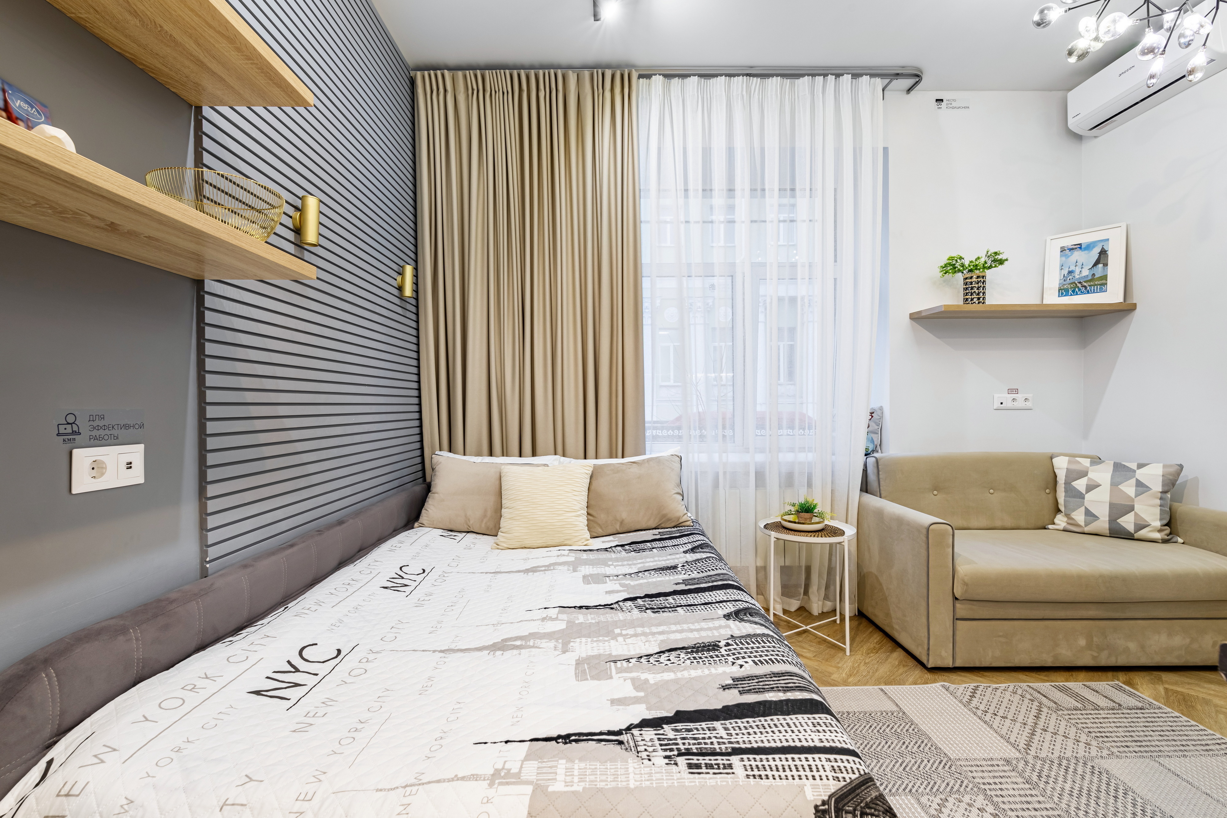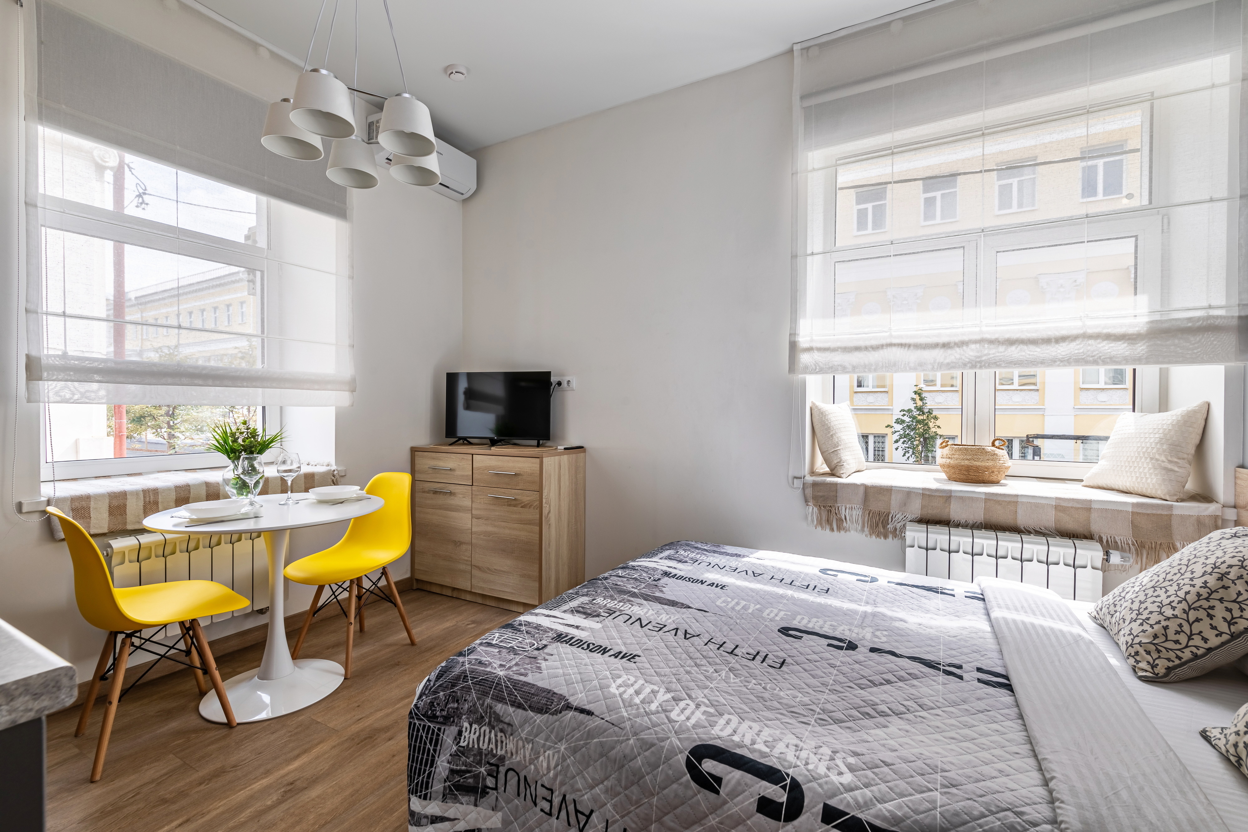 Интерьеры выполнены в современном дизайне с использованием спокойных тонов, создающих атмосферу уюта и расслабления. В распоряжении гостей — широкие двуспальные кровати, односпальные кровати, двухспальные диваны-кровати с ортопедическими матрасами, а также дополнительные подушки и одеяла. В каждом номере есть обеденный стол, вместительный шкаф или комод, вешалка, телевизор и кондиционер. Для работы предусмотрена отдельная зона в некоторых категориях. Кухня полностью оборудована всем необходимым для приготовления еды. В ванной комнате — душевая кабина, стиральная машина, фен, тапочки, зубные щётки с пастой и разнообразные туалетно-косметические принадлежности. На всей территории работает Wi-Fi.Это место создано для тех, кто ценит продуманность каждой детали и атмосферу настоящего гостеприимства. Здесь можно с комфортом разместиться, наслаждаясь тишиной и уютом, и при этом быть в самом сердце городской жизни, вдохновляясь видами и энергией Казани.