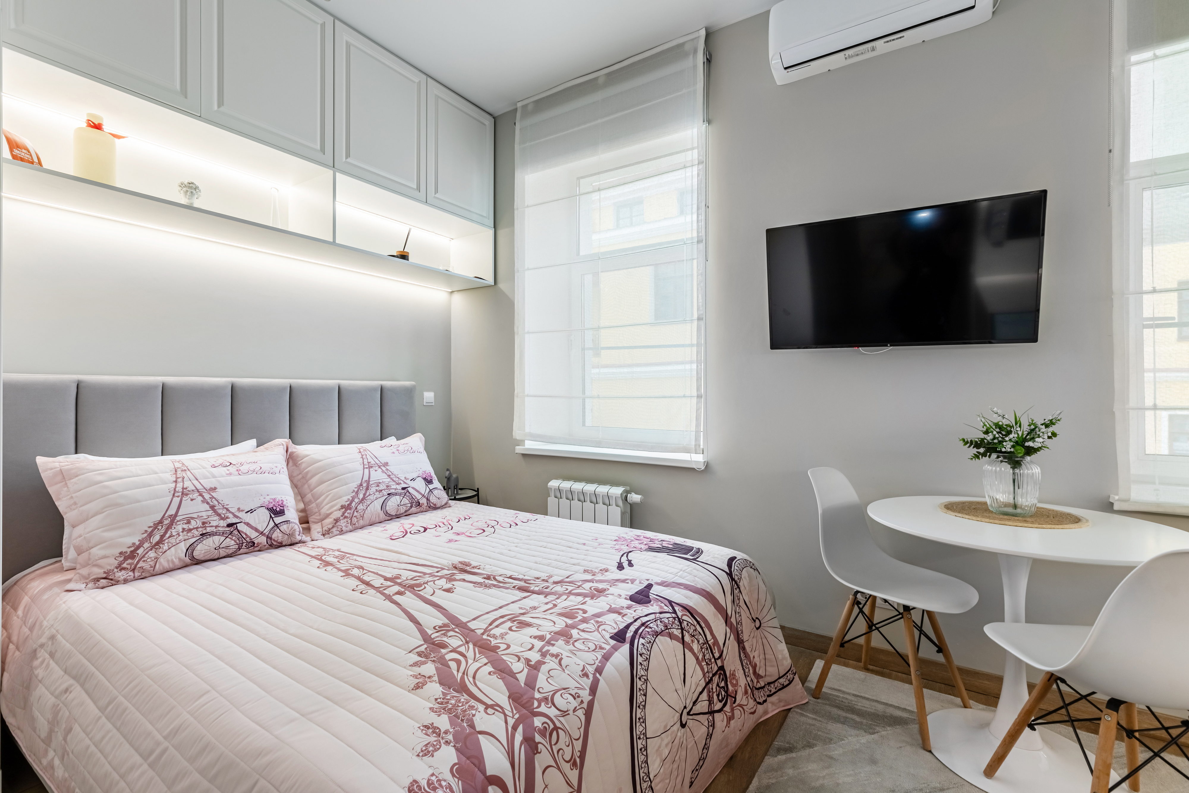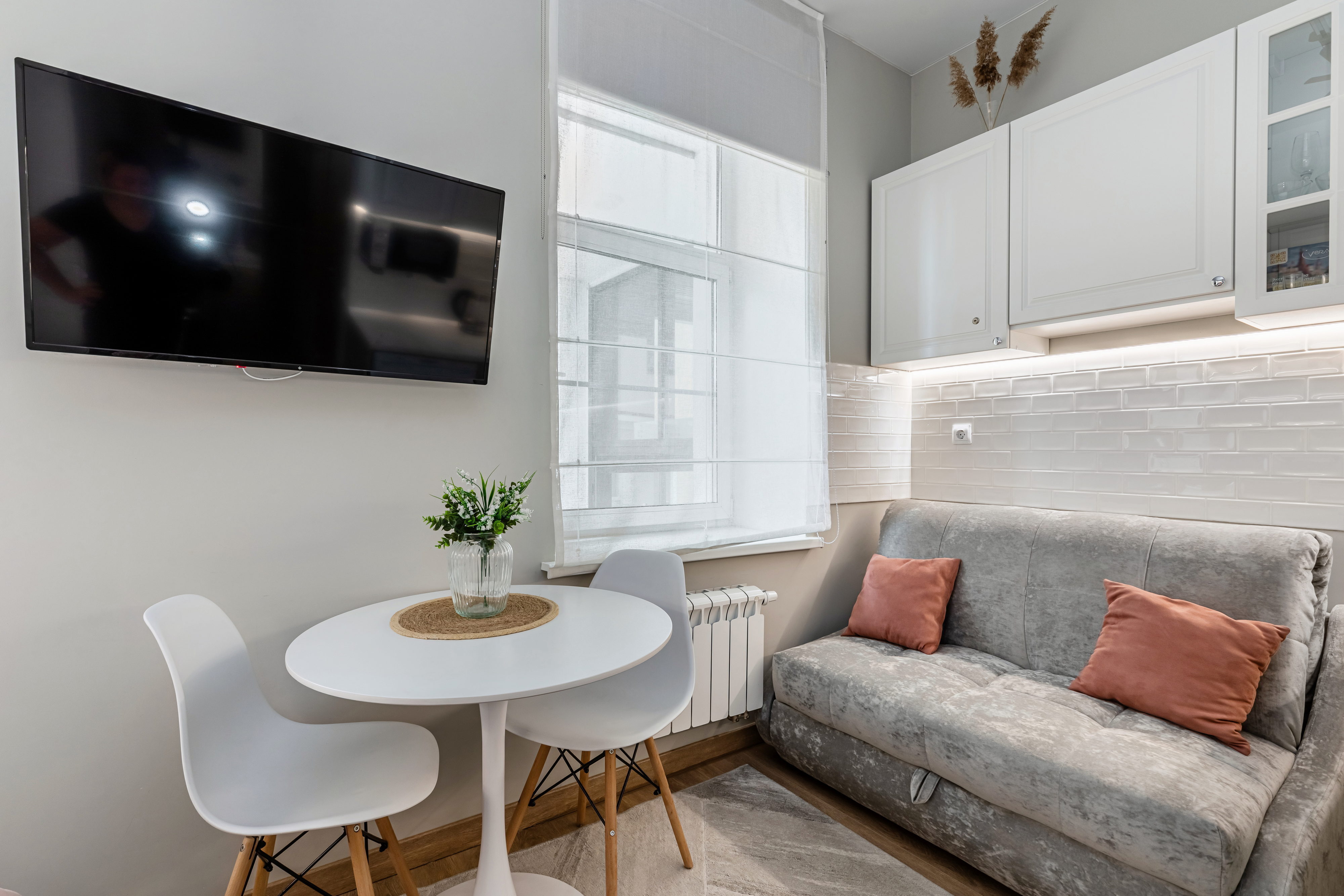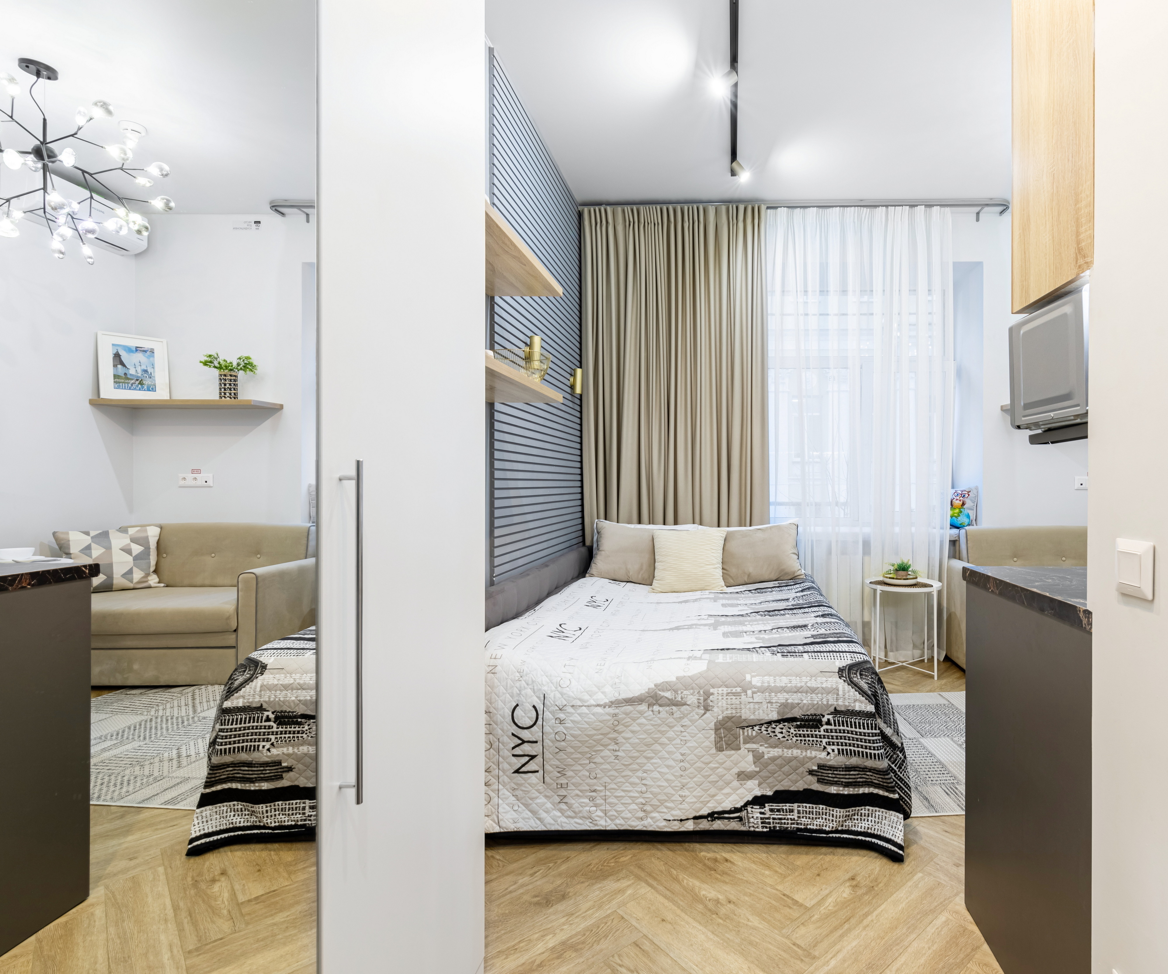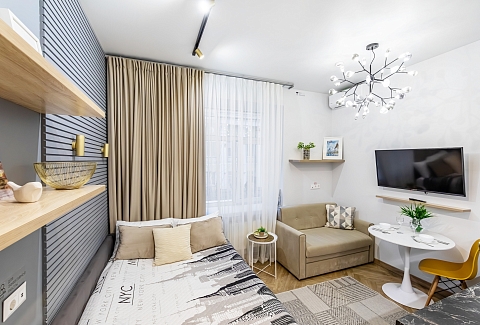 Интерьеры выполнены в современном дизайне с использованием спокойных тонов, создающих атмосферу уюта и расслабления. В распоряжении гостей — широкие двуспальные кровати, односпальные кровати, двухспальные диваны-кровати с ортопедическими матрасами, а также дополнительные подушки и одеяла. В каждом номере есть обеденный стол, вместительный шкаф или комод, вешалка, телевизор и кондиционер. Для работы предусмотрена отдельная зона в некоторых категориях. Кухня полностью оборудована всем необходимым для приготовления еды. В ванной комнате — душевая кабина, стиральная машина, фен, тапочки, зубные щётки с пастой и разнообразные туалетно-косметические принадлежности. На всей территории работает Wi-Fi.Это место создано для тех, кто ценит продуманность каждой детали и атмосферу настоящего гостеприимства. Здесь можно с комфортом разместиться, наслаждаясь тишиной и уютом, и при этом быть в самом сердце городской жизни, вдохновляясь видами и энергией Казани.
