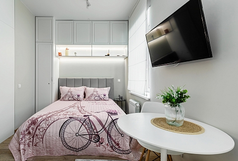 В номере: вешалка, диван раскладной, зеркало, кровать двуспальная, стол, стулья, шкаф, кондиционер, микроволновая печь, стиральная машина, телевизор, утюг, холодильник