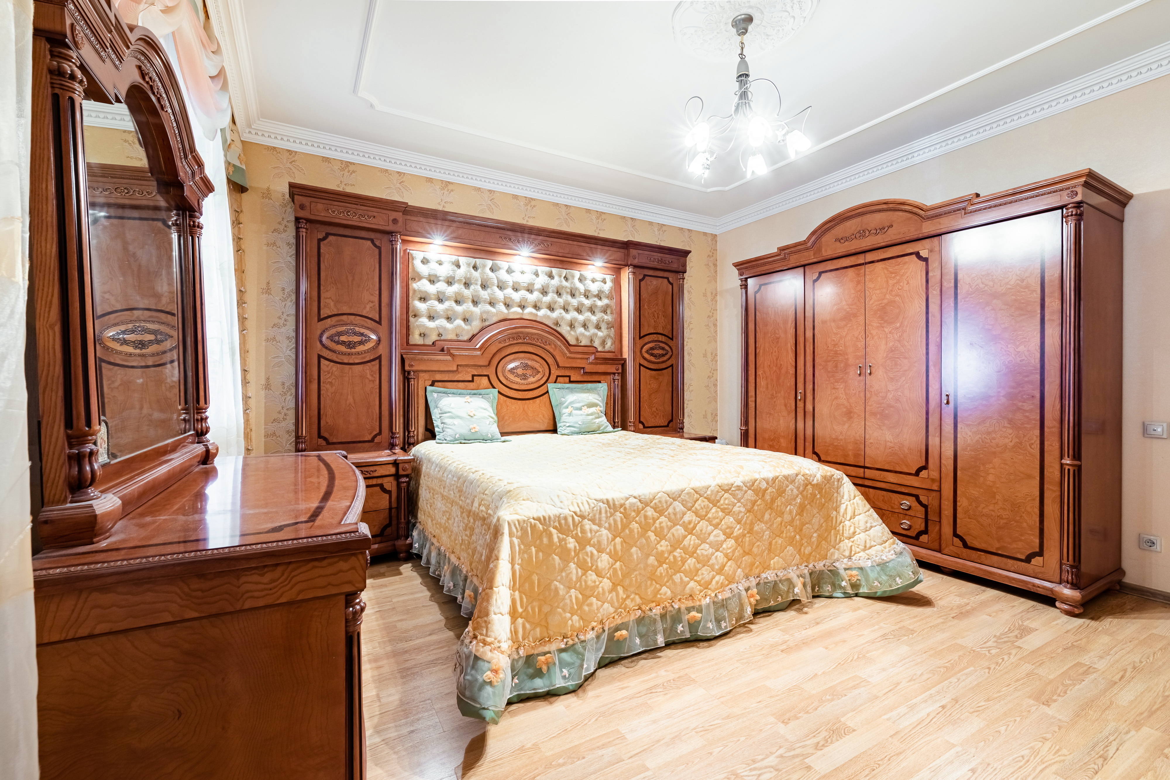 В номере: вешалка, диван раскладной, зеркало, кровать двуспальная, прикроватные тумбочки, стол, стулья, шкаф, кондиционер, микроволновая печь, музыкальный центр, сейф, стиральная машина, телевизор, утюг, холодильник
