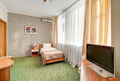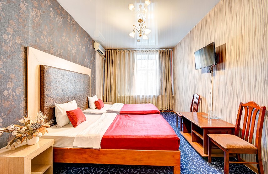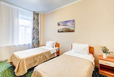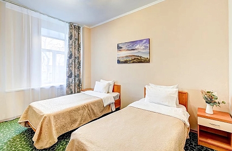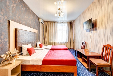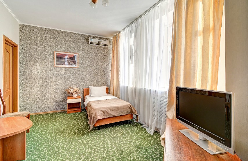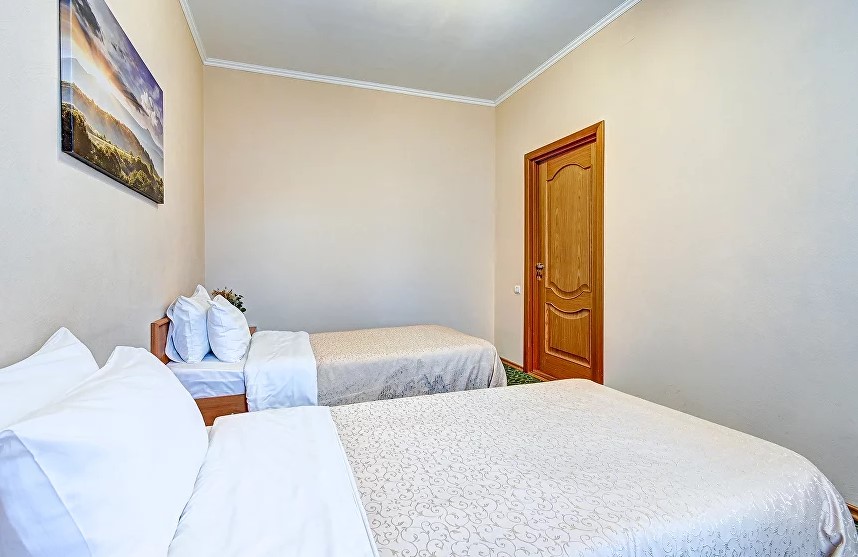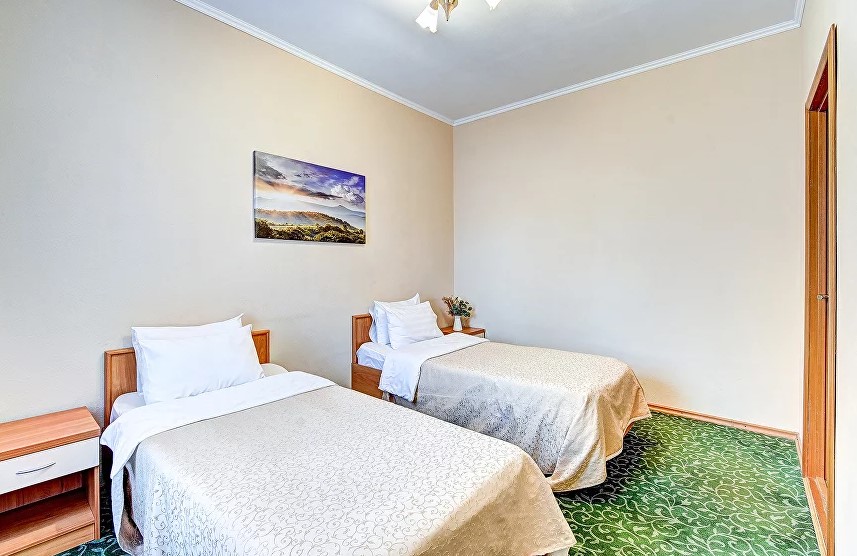 В номере: вешалка, зеркало, кровати односпальные, прикроватные тумбочки, стол, стулья, шкаф, кондиционер, мини-холодильник, телевизор
