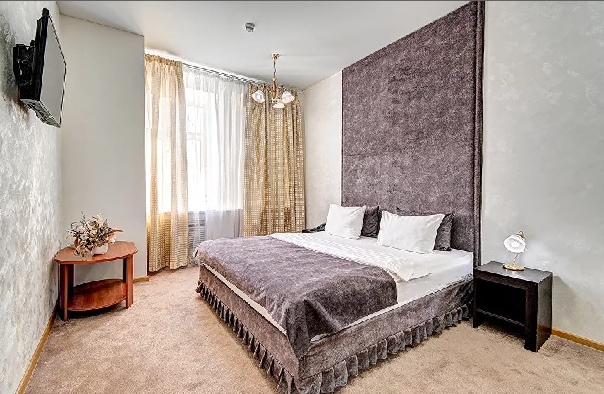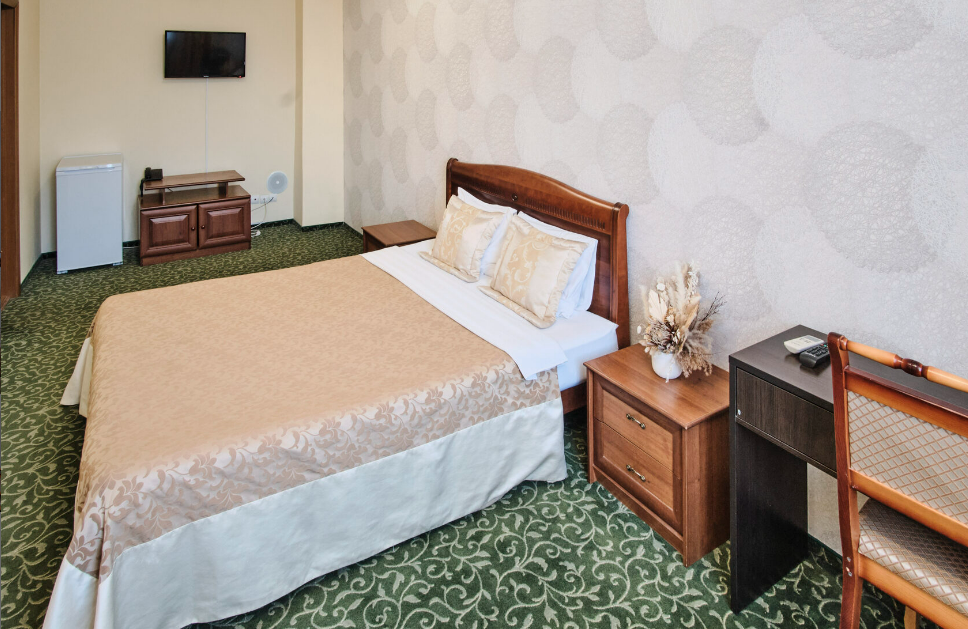 В номере: вешалка, зеркало, кровать двуспальная, прикроватные тумбочки, стол, стулья, шкаф, кондиционер, мини-холодильник, телевизор