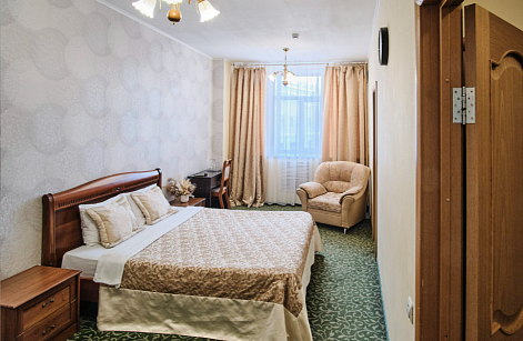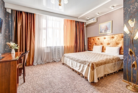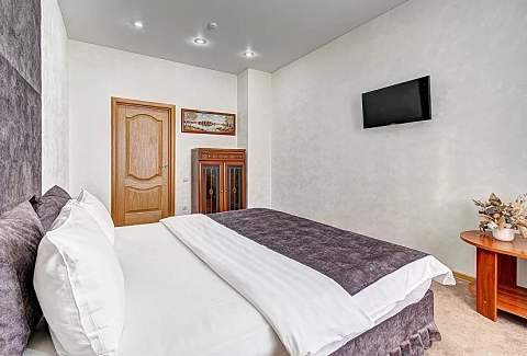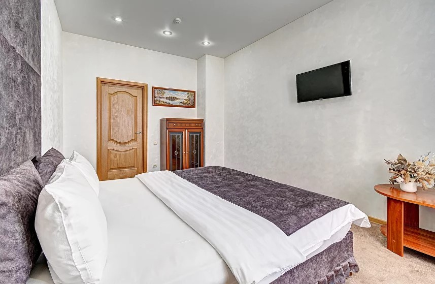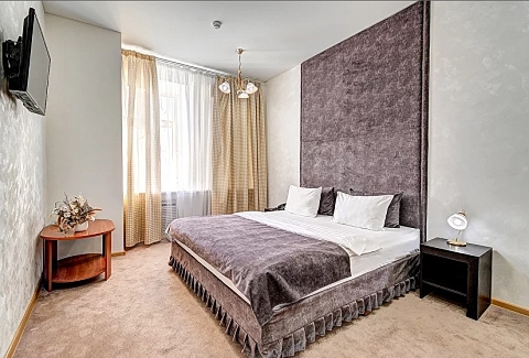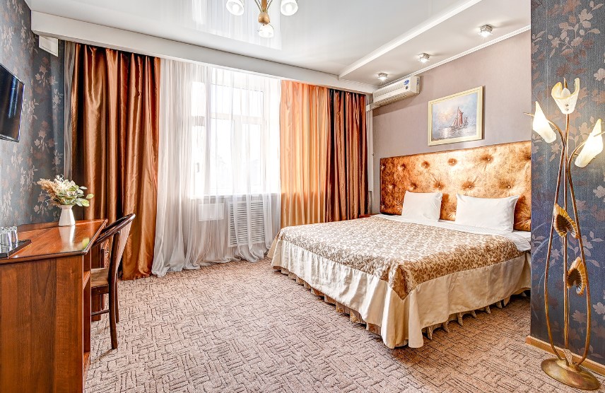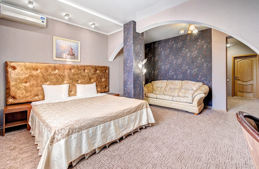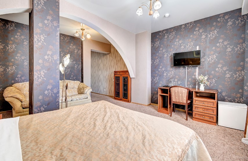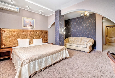 В номере: вешалка, диван, зеркало, кровать двуспальная, прикроватные тумбочки, стол, стулья, шкаф, кондиционер, мини-холодильник, телевизор