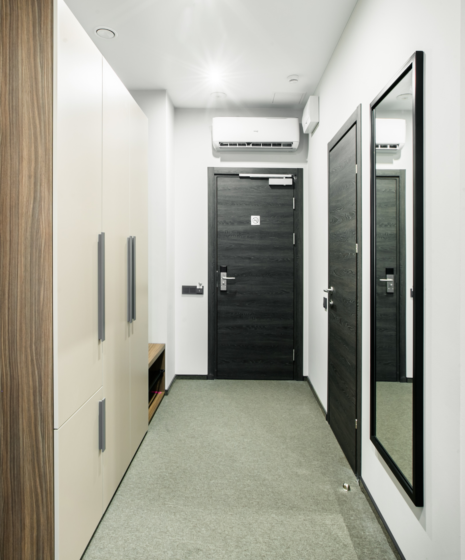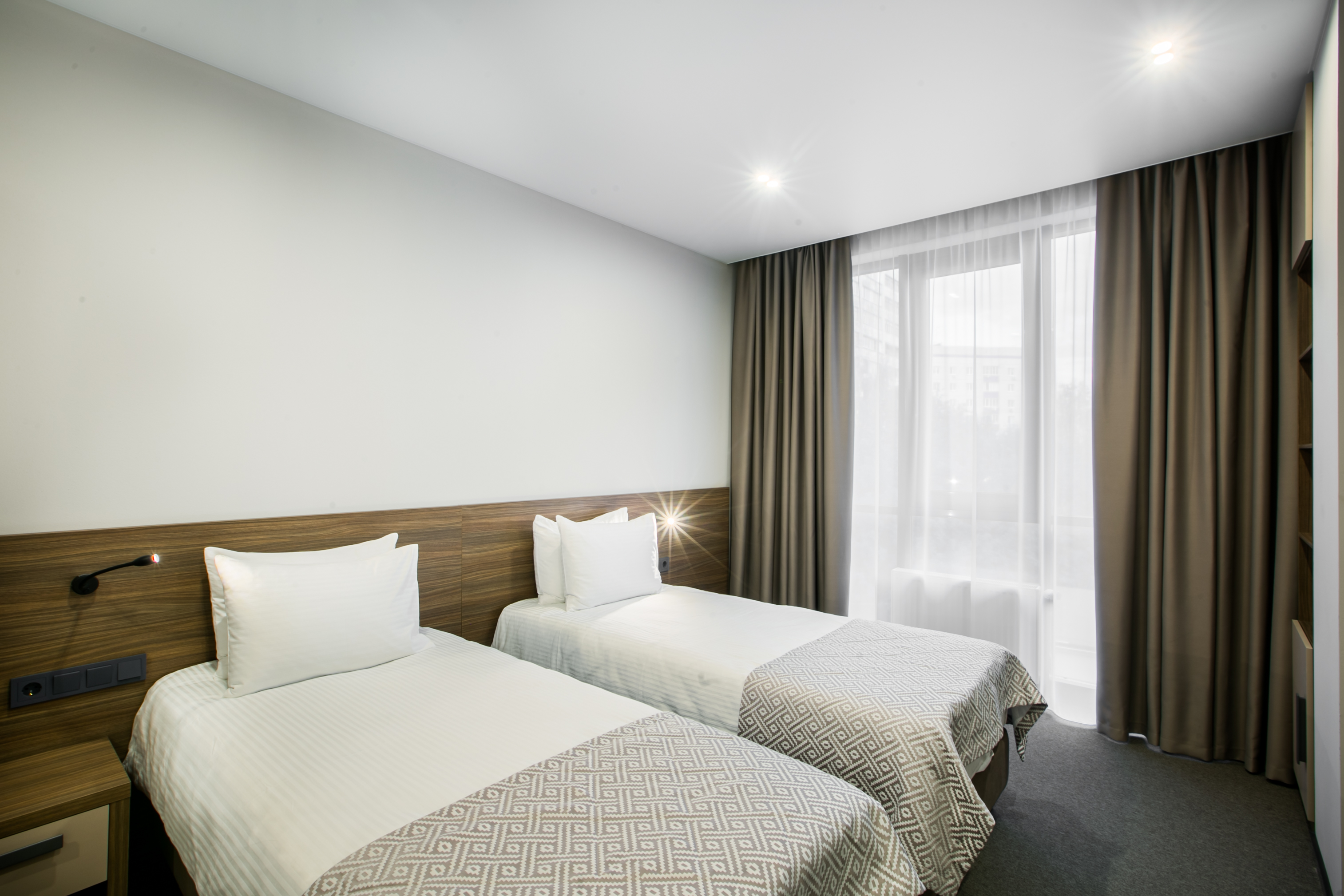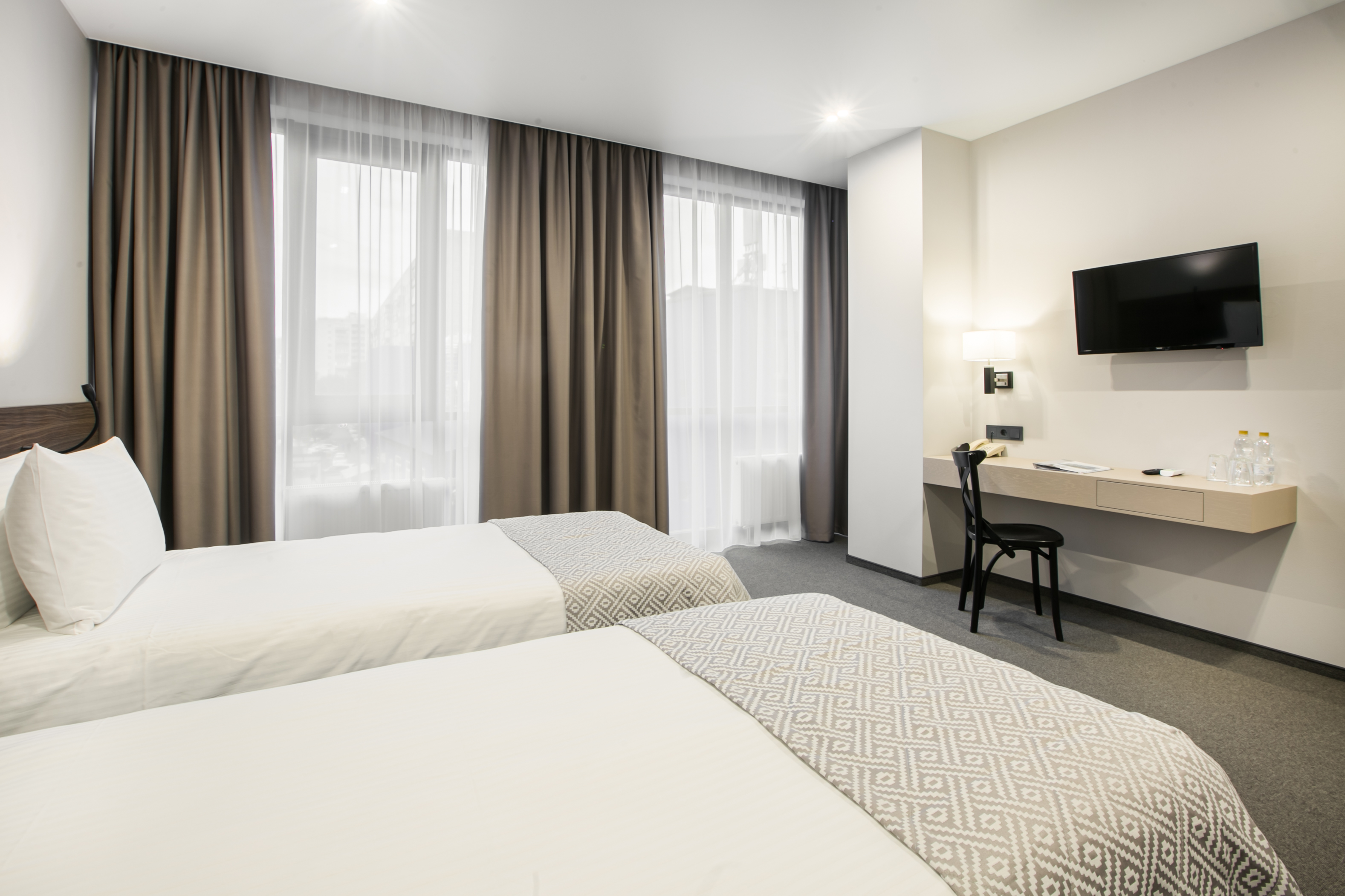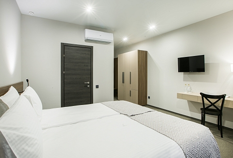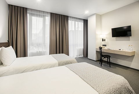 В номере: зеркало, кровати односпальные, прикроватные тумбочки, стол, стулья, шкаф, мини-холодильник, сейф, сплит-система, телевизор, телефон, утюг, чайная станция