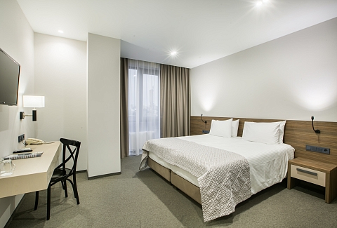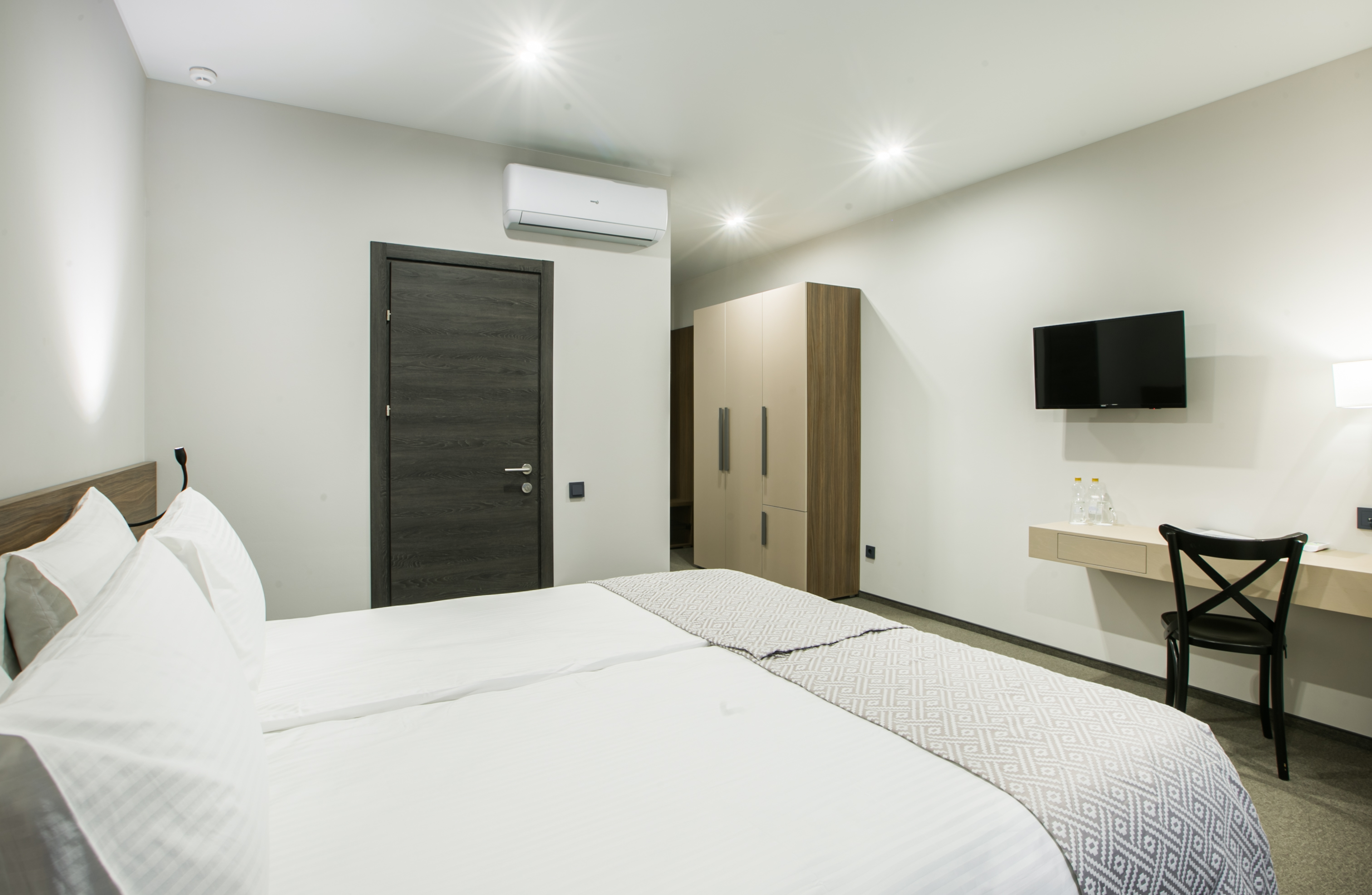 В номере: зеркало, кровать двуспальная, прикроватные тумбочки, стол, стулья, шкаф, мини-холодильник, сейф, сплит-система, телевизор, телефон, утюг, чайная станция