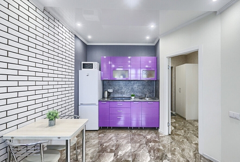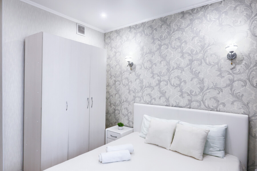 В номере: диван, диван раскладной, кровать двуспальная, прикроватные тумбочки, стол, стулья, шкаф, гладильная доска, кондиционер, микроволновая печь, набор посуды, плита электрическая, стиральная машина, телевизор, утюг, холодильник, чайник