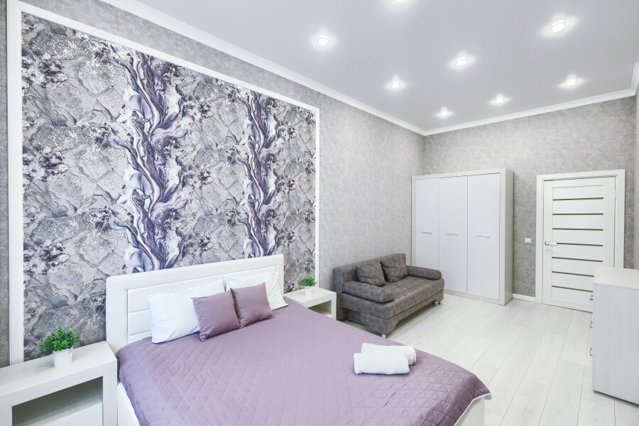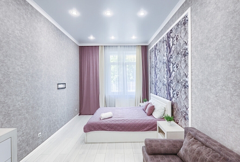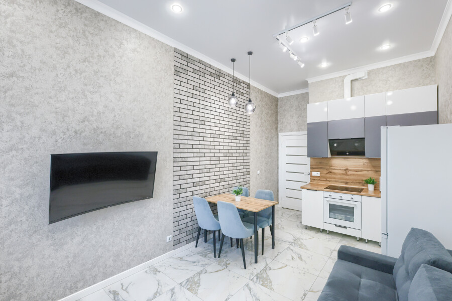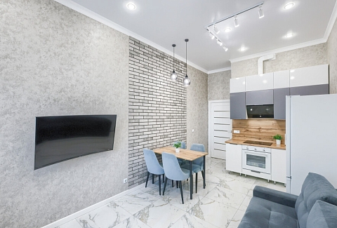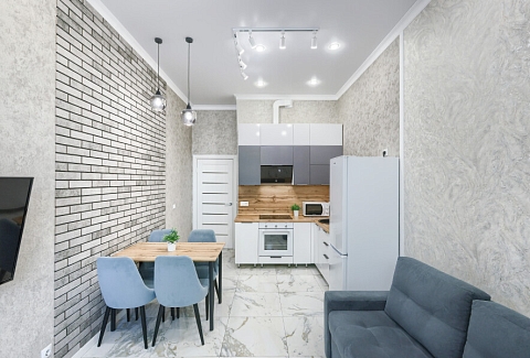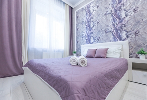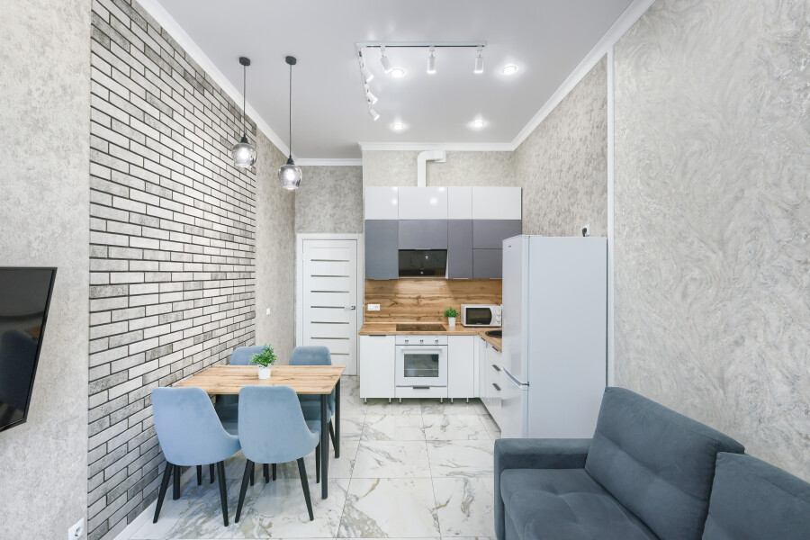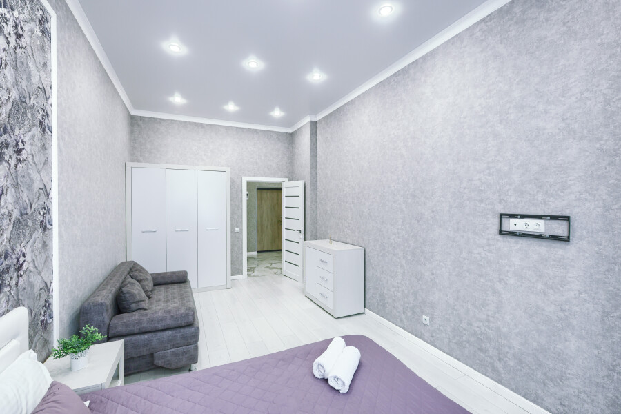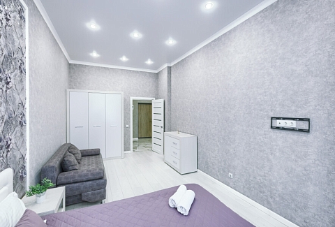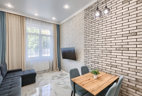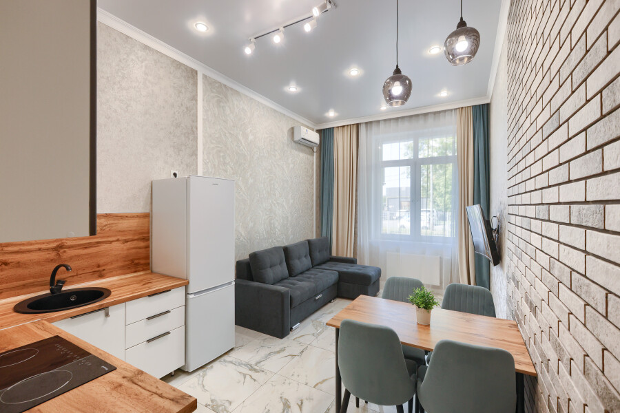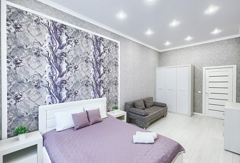 В соседнем здании открыты продуктовые магазины и ресторан.Светлая изолированная спальня укомплектована двуспальной кроватью, диваном, шкафом и комодом. В кухне-гостиной оборудованы компактное пространство для приготовления еды и обеденная зона со столом и мягкими стульями, установлен раскладной диван напротив телевизора. Санузел оснащен ванной. Для постояльцев предусмотрено подключение к Wi-Fi.