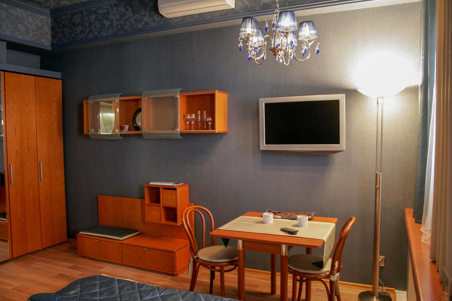 В номере: вешалка, зеркало, кровати односпальные /одна двуспальная кровать, стол, стул, шкаф, кондиционер, сейф, телевизор
