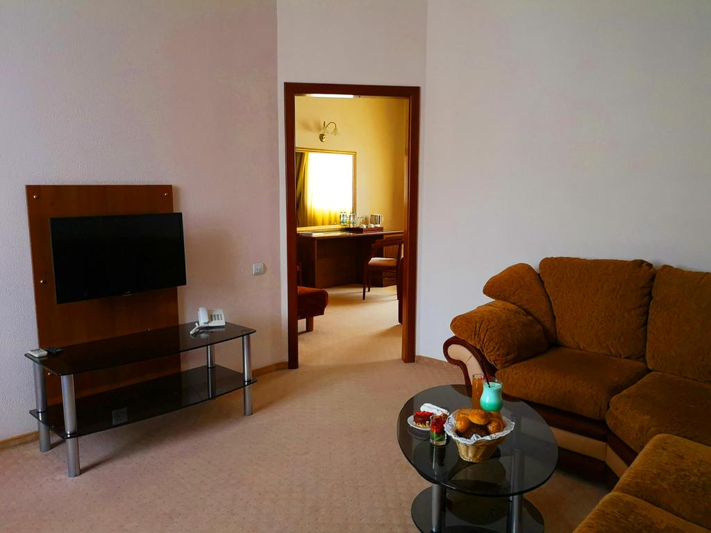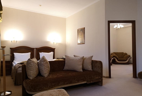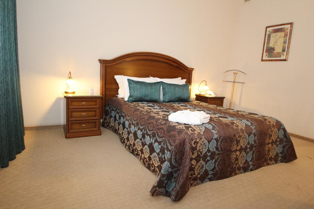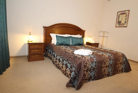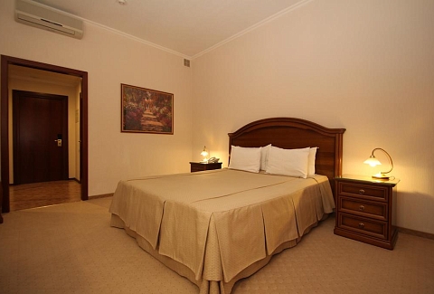 В номере: вешалка, зеркало, кровать двуспальная, набор мягкой мебели, столик журнальный, шкаф, кондиционер, мини-холодильник, сейф, телевизор, телефон