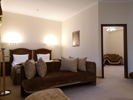 Гостям предлагаются стильные номера, оформленные в светлых оттенках, высоких категории комфорта – Улучшенный, Бизнес и Люкс. В номерах есть вся необходимая бытовая техника, удобная и качественная мебель санузел с ванной и косметическими принадлежностями. В отеле работает фитнес-центр, раздельный для мужчин и женщин, оборудованы небольшой конференц-зал и переговорная комната, возле корпуса организована детская игровая площадка.