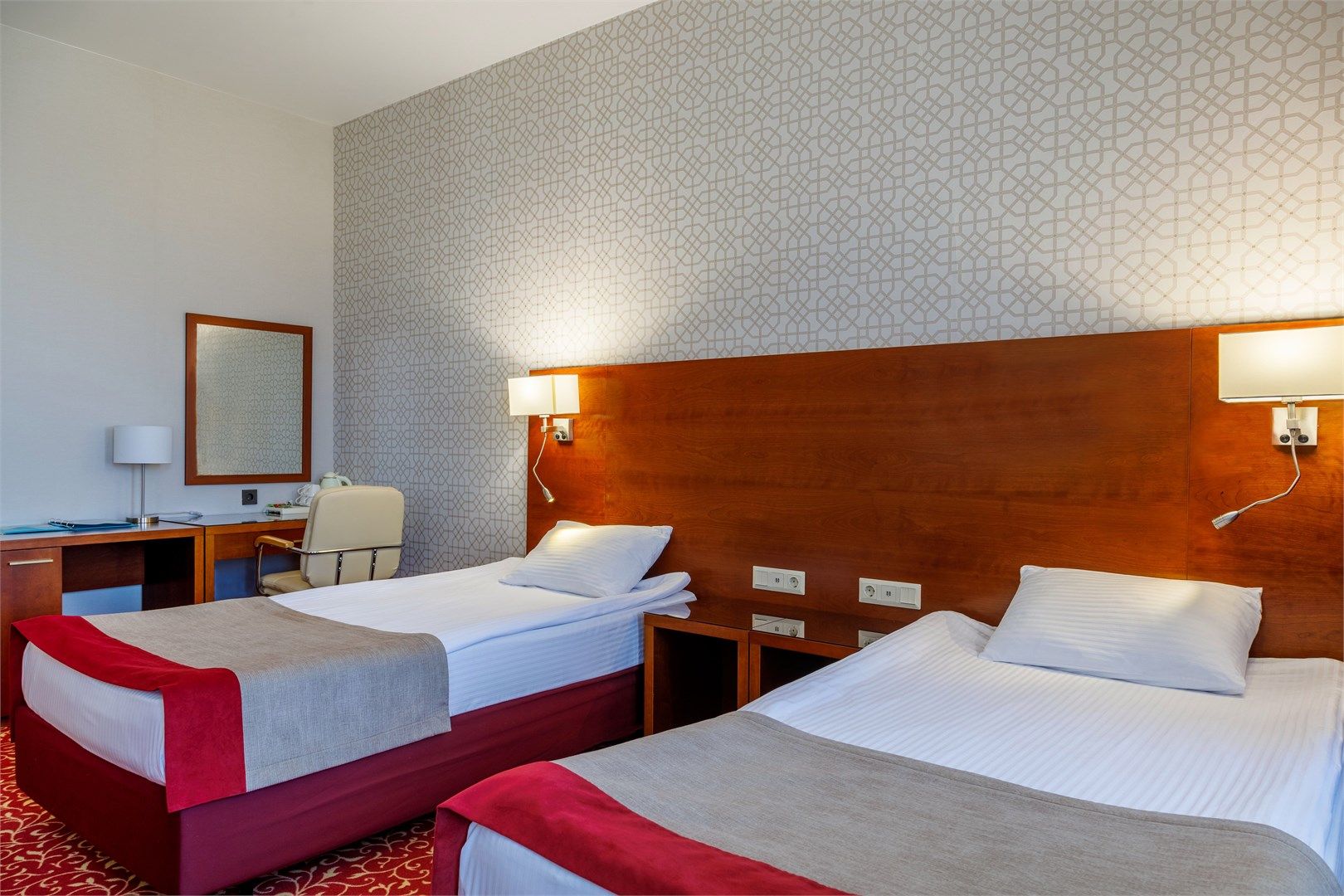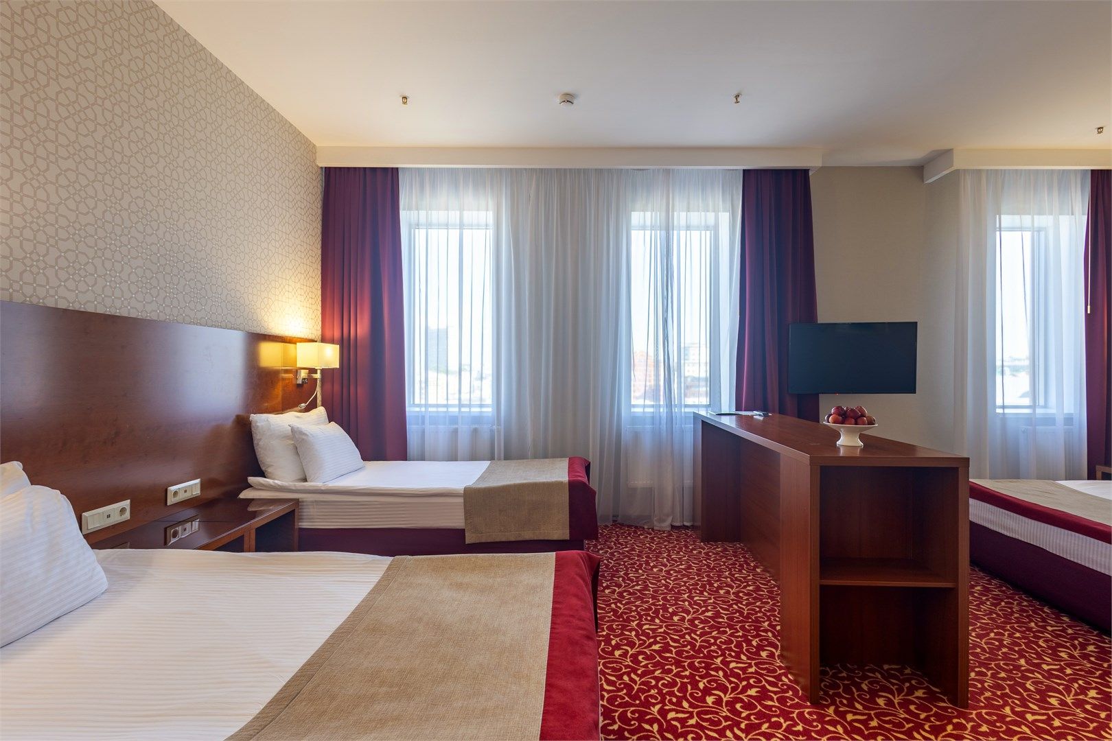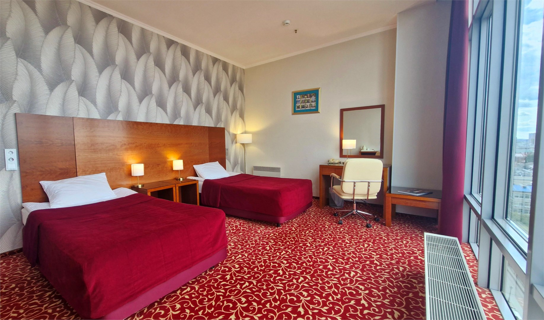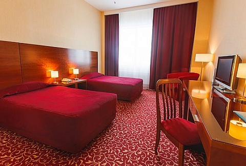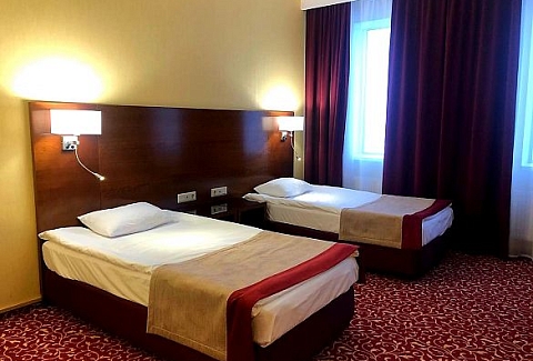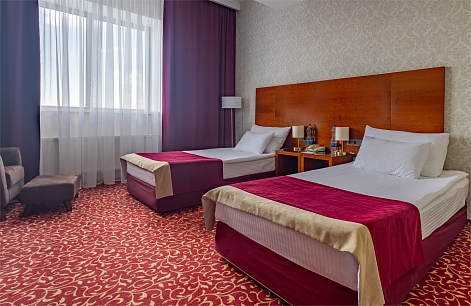 В номере: вешалка, кровати полутороспальные, прикроватные тумбочки, стол, стулья, шкаф, кондиционер, сейф, телевизор, телефон