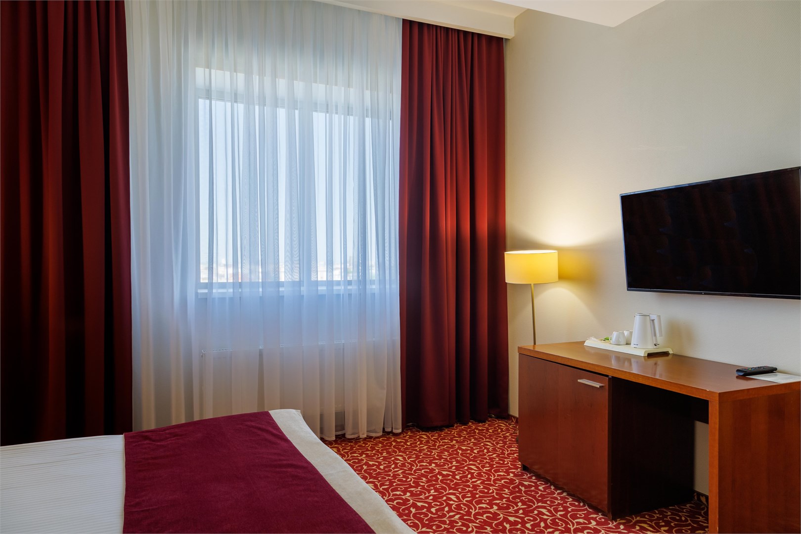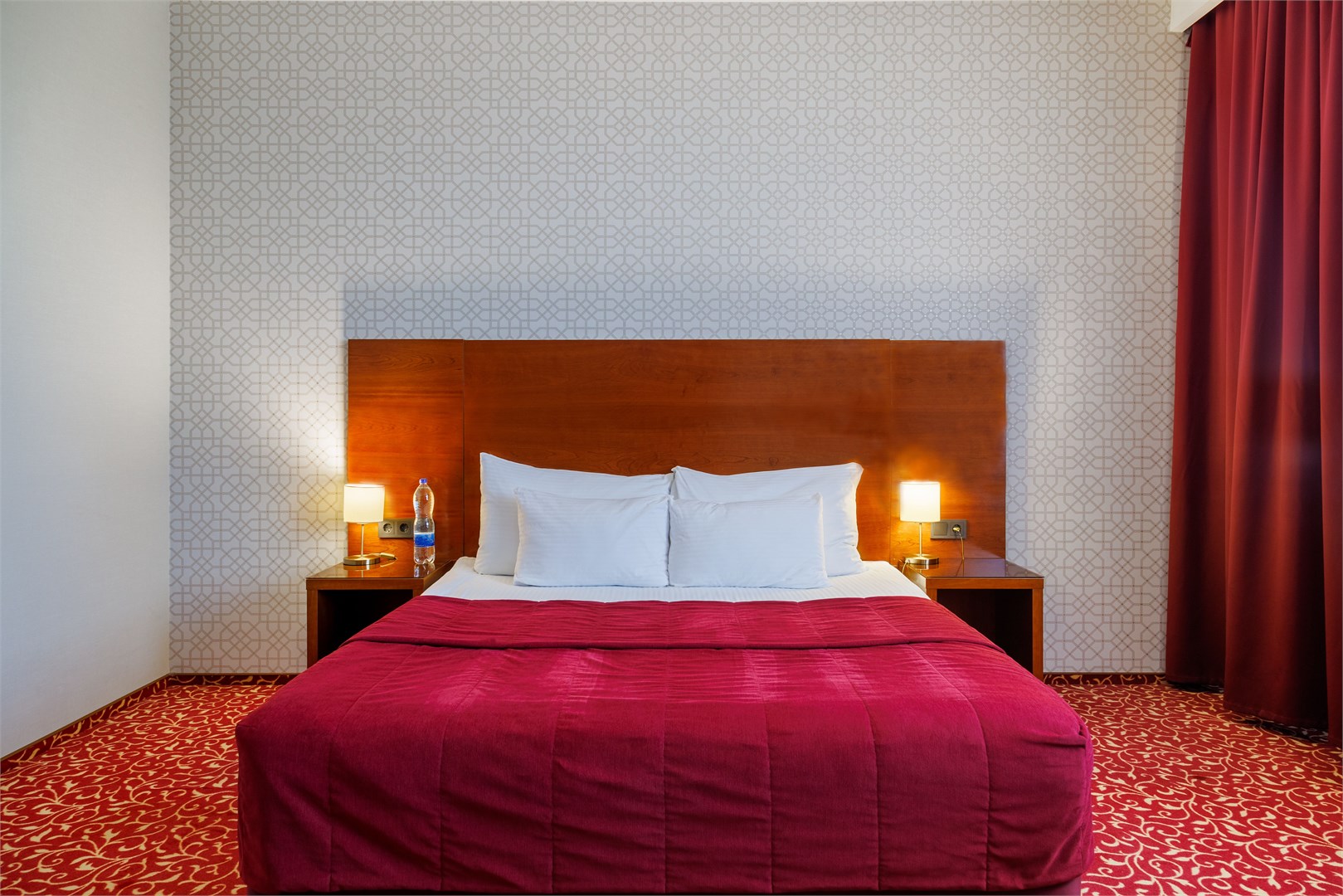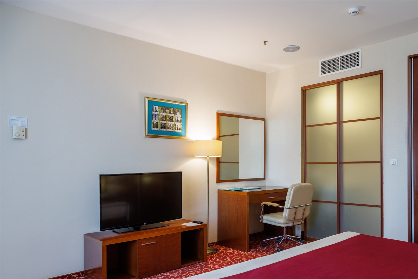 В номере: вешалка, зеркало, кровать двуспальная, прикроватные тумбочки, стол, стулья, шкаф, кондиционер, сейф, телевизор, телефон