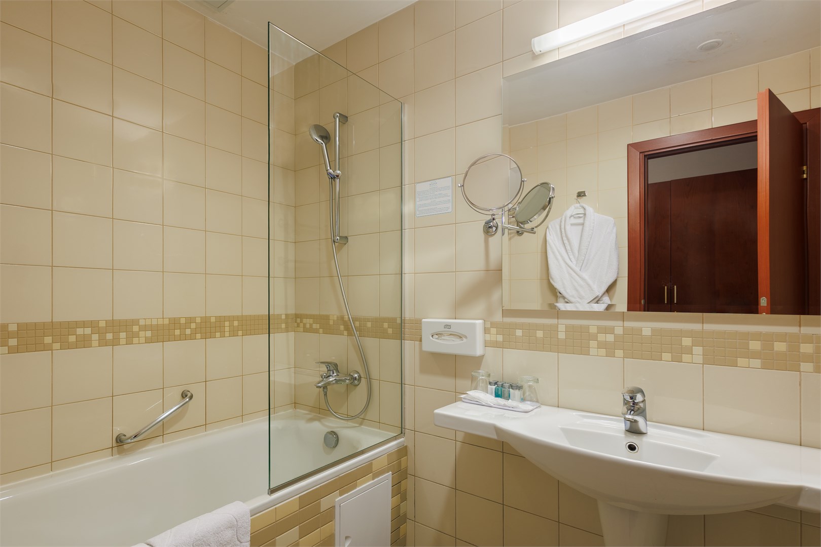 Санузел: с ванной и душевой кабиной, тапочки, туалетные принадлежности, фен, халат