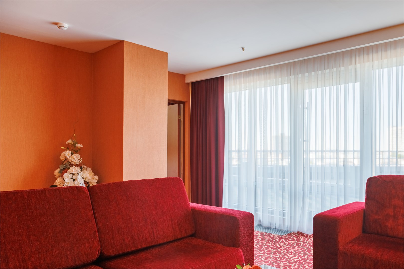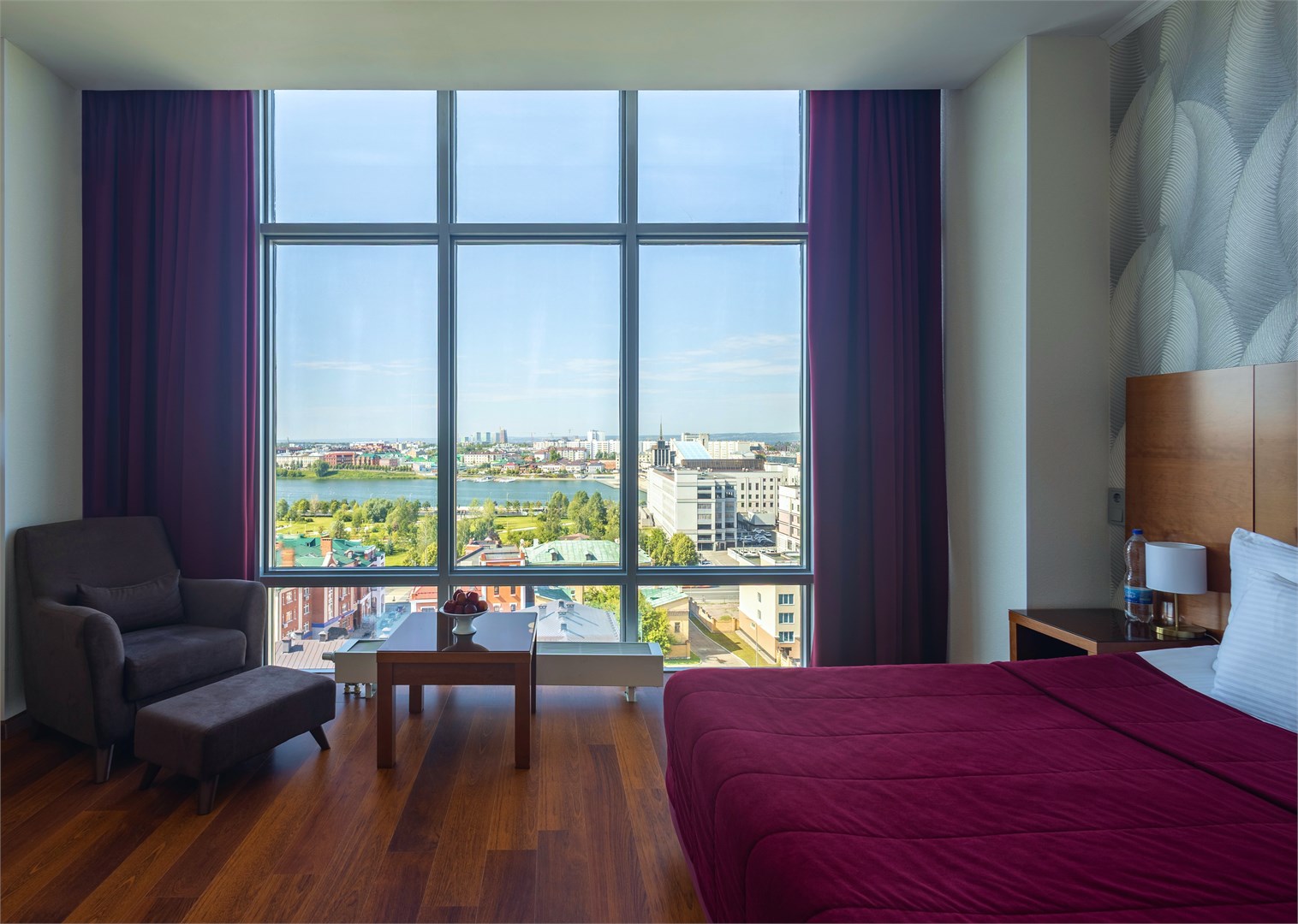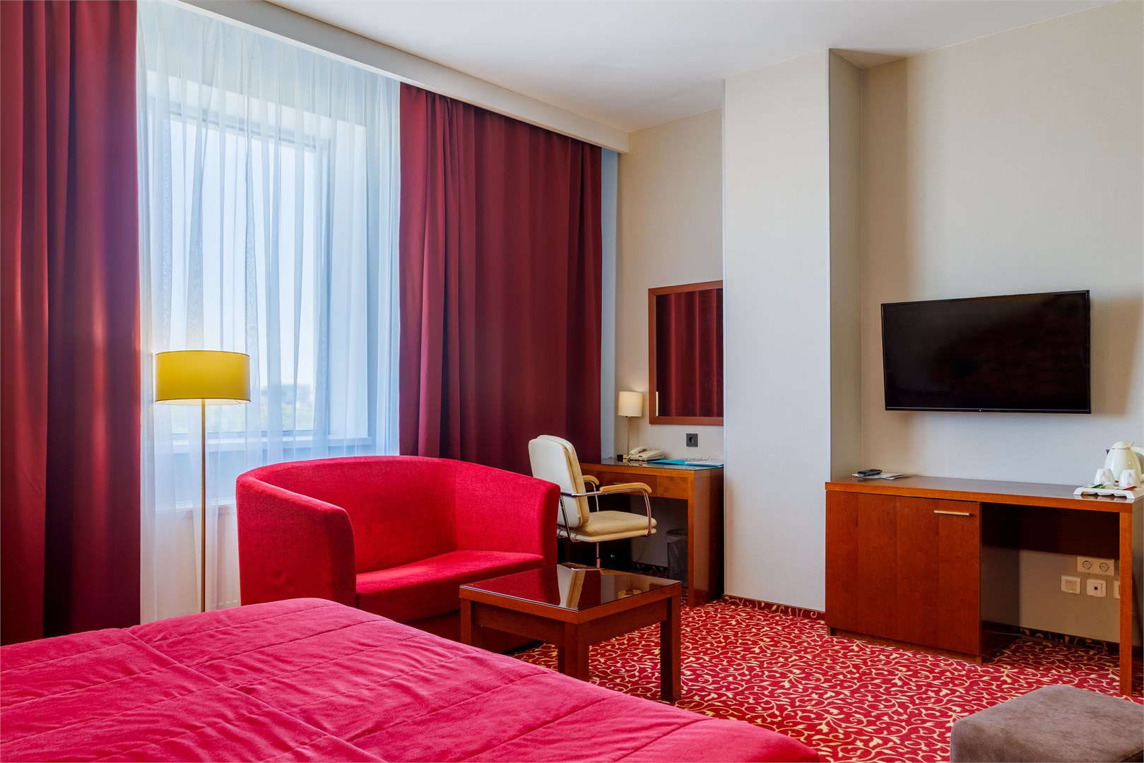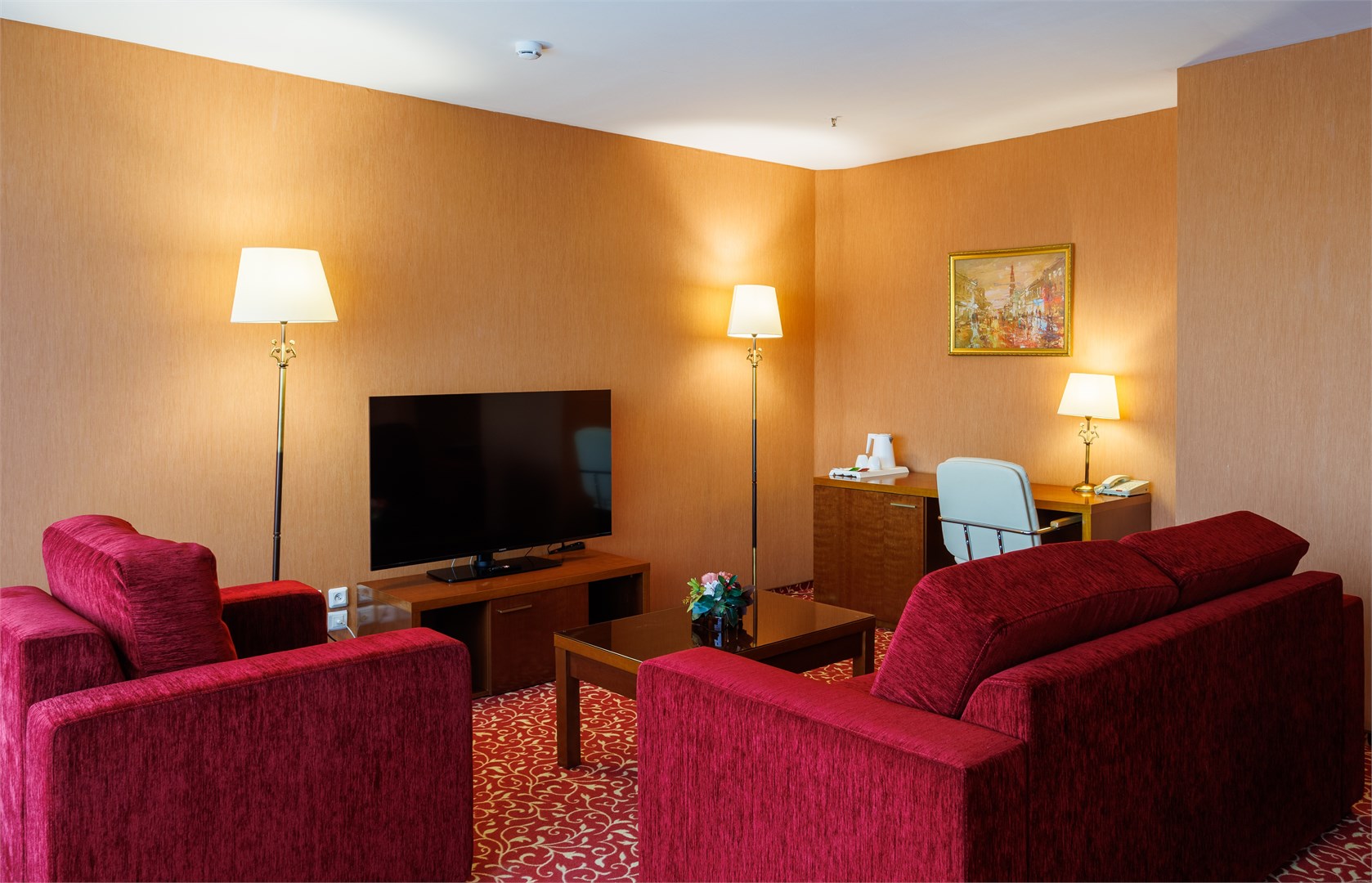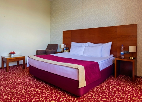 В номере: вешалка, зеркало, кровать двуспальная, набор мягкой мебели, прикроватные тумбочки, стол, стулья, шкаф, кондиционер, сейф, телевизор, телефон