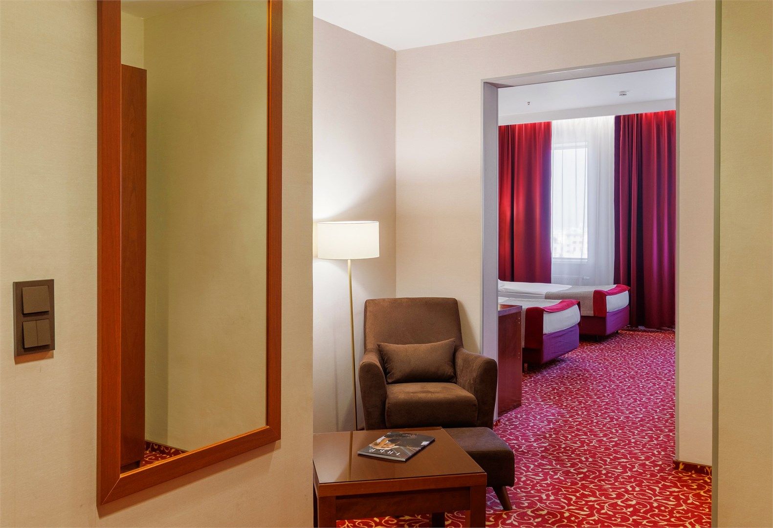 В номере: вешалка, зеркало, кровати полутороспальные, набор мягкой мебели, прикроватные тумбочки, стол, стулья, шкаф, кондиционер, сейф, телевизор, телефон