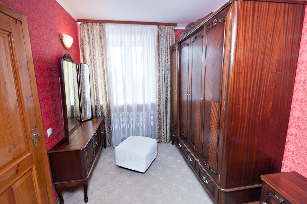 В номере: вешалка, диван, зеркало, кровати односпальные /одна двуспальная кровать, прикроватные тумбочки, стол, стулья, шкаф, сейф, телевизор ЖК, телефон, холодильник, чайный набор посуды, электрочайник