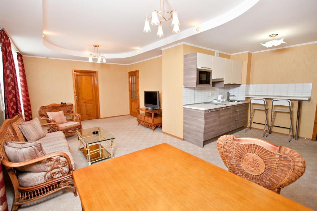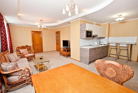 В номере: вешалка, диван раскладной, зеркало, кресла, кровать двуспальная, кухонная мебель, набор мягкой мебели, прикроватные тумбочки, стол, стулья, шкаф, сейф, телевизор ЖК, телефон, утюг, холодильник, чайный набор посуды, электрочайник