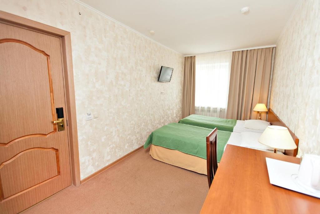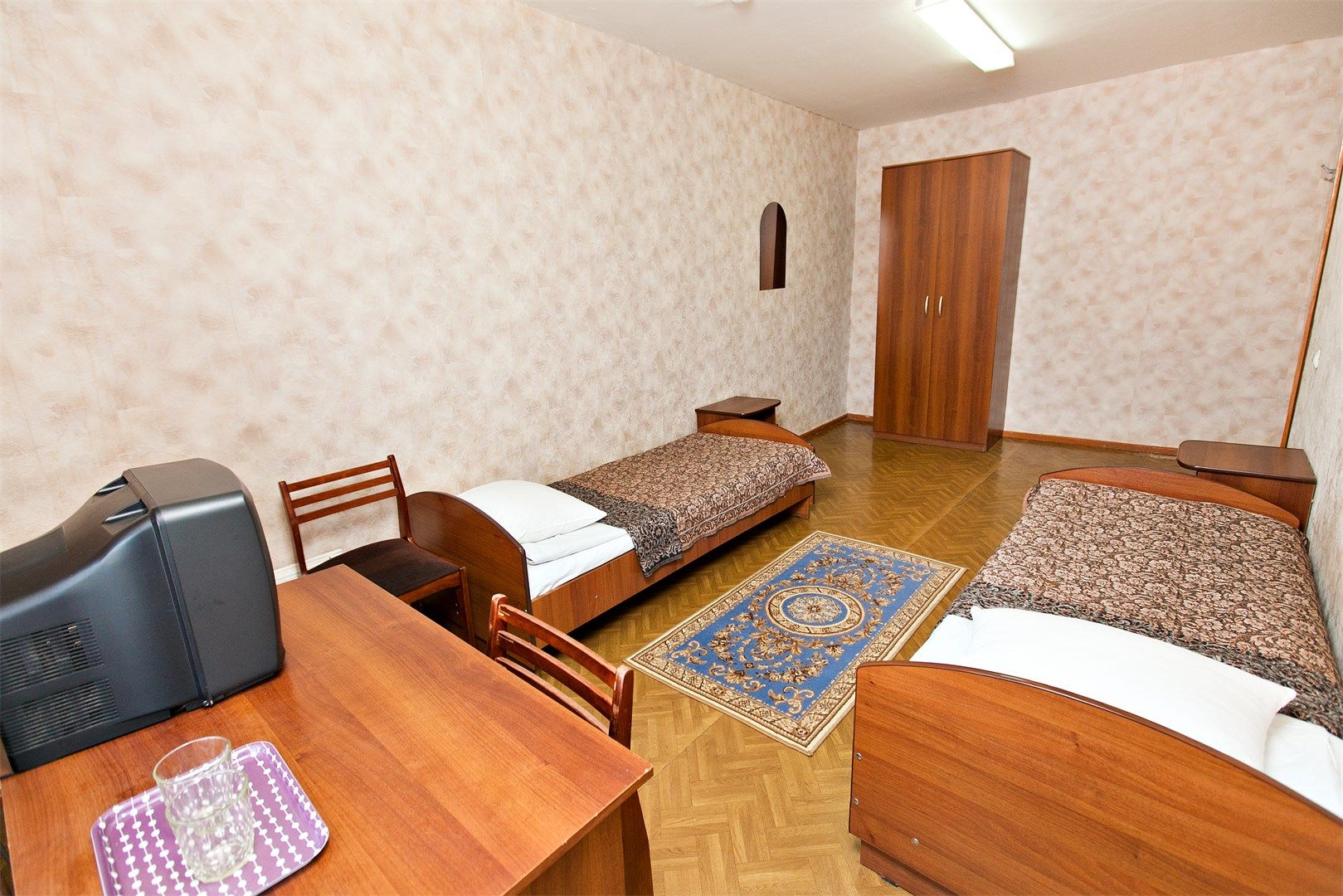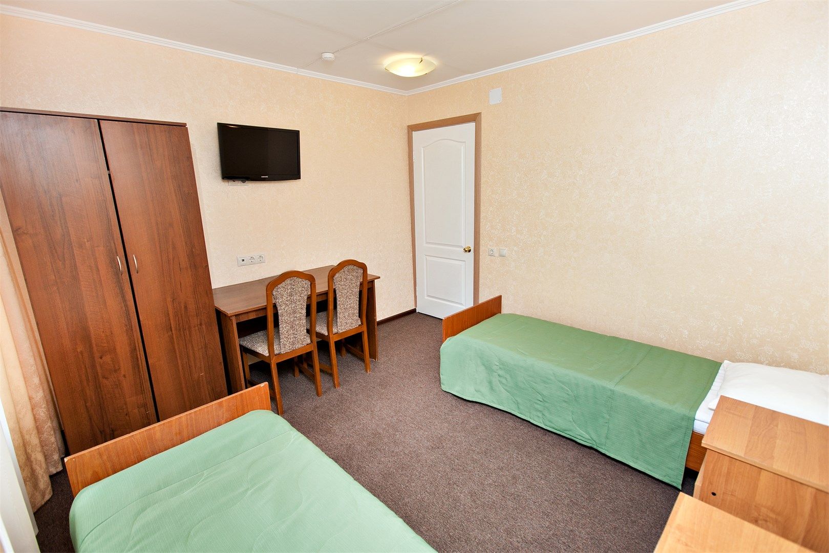 В номере: вешалка, зеркало, кровати односпальные, стол, стулья, телевизор, холодильник, электрочайник