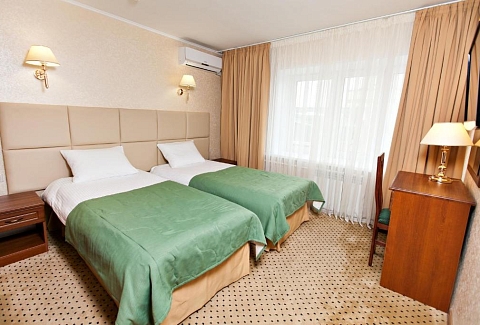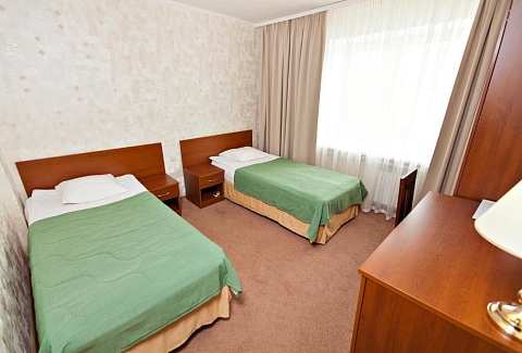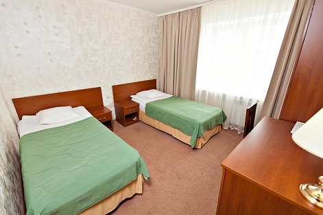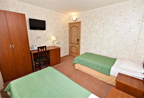 В номере: вешалка, зеркало, кровати односпальные /одна двуспальная кровать, прикроватные тумбочки, стол, стулья, шкаф, сейф, телевизор ЖК, телефон, холодильник, электрочайник