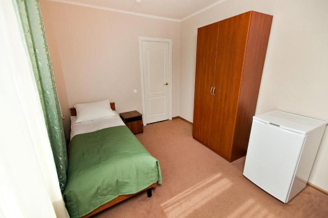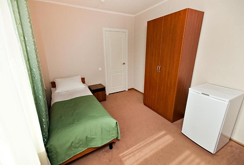 В номере: вешалка, зеркало, кровать односпальная, прикроватная тумбочка, стол, стулья, шкаф, сейф, телевизор ЖК, телефон, холодильник, электрочайник