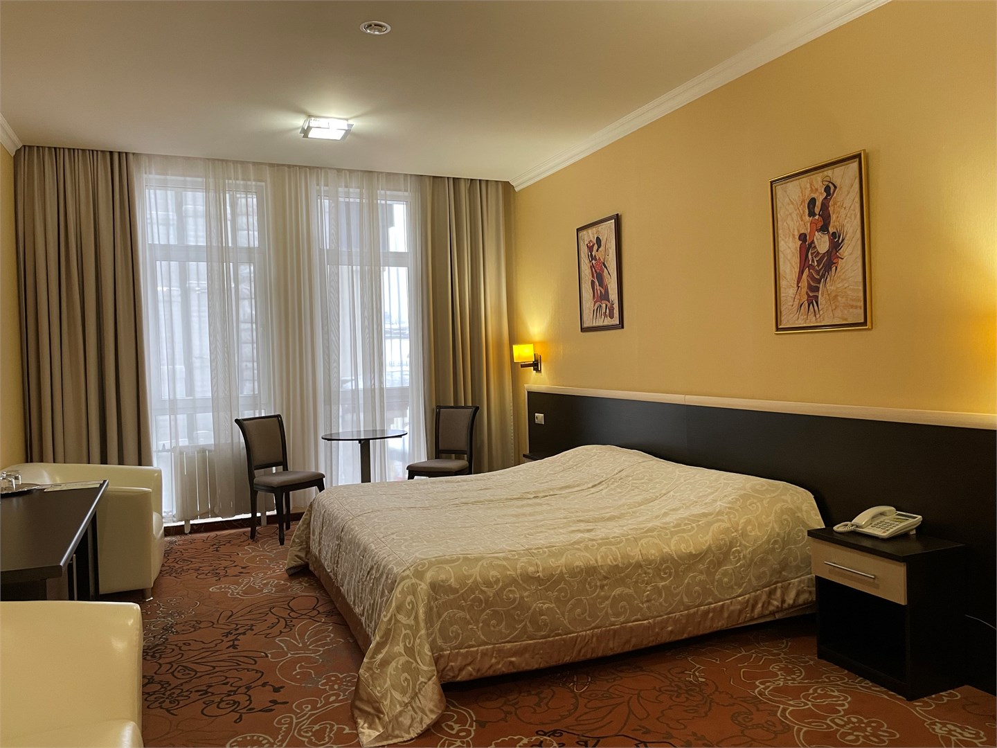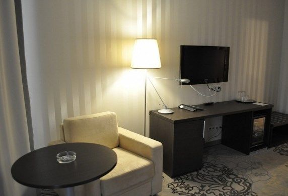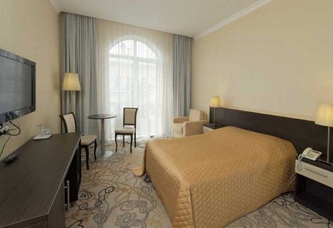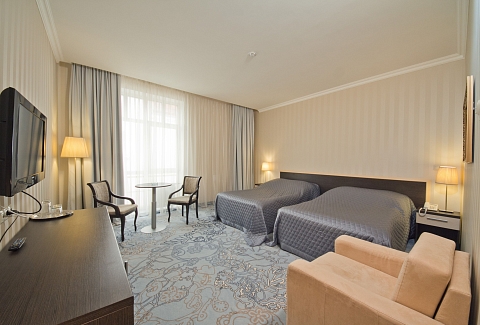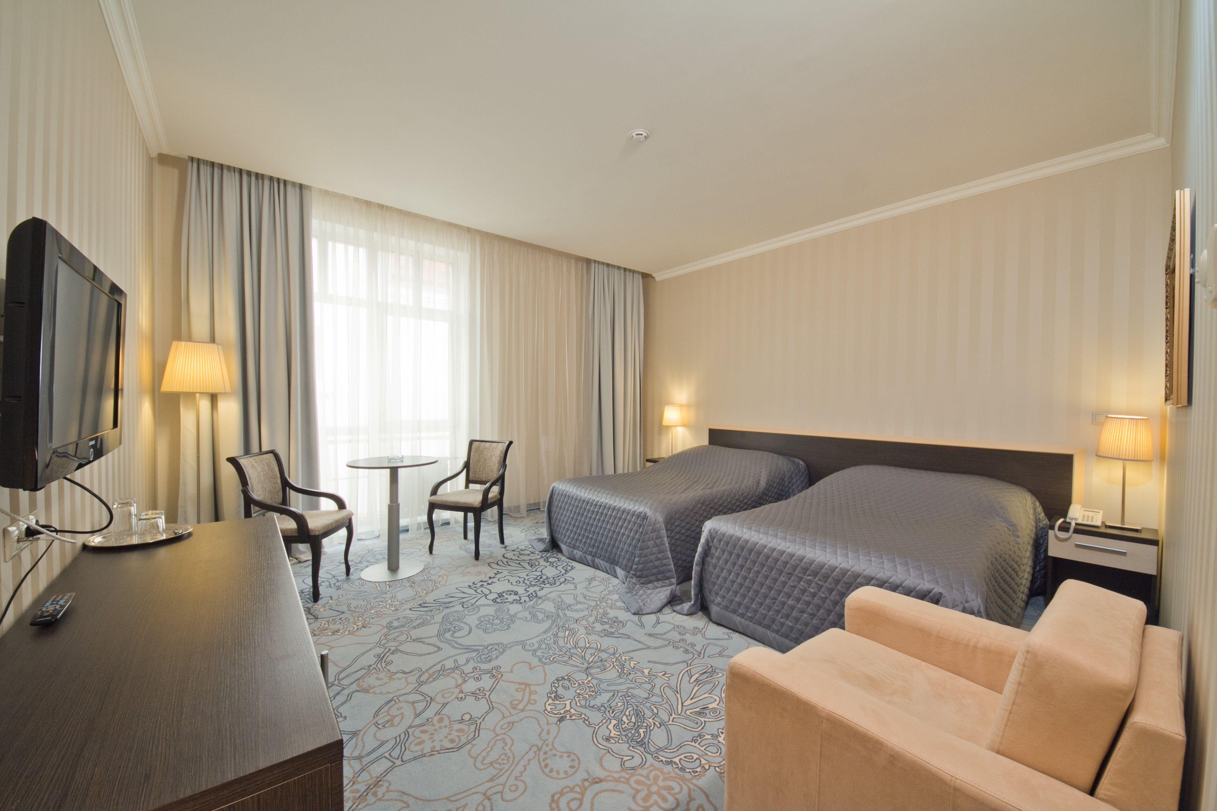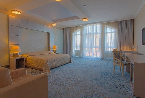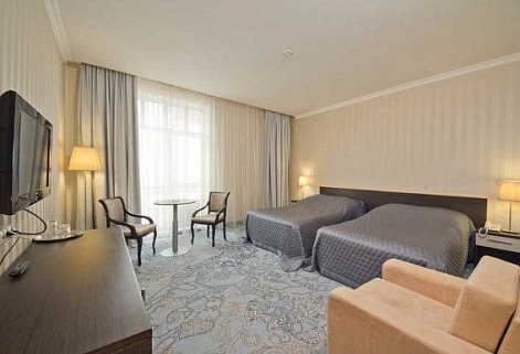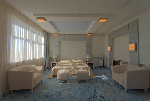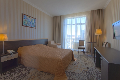 В номере: вешалка, диван, зеркало, кресло, кровать двуспальная, прикроватные тумбочки, стол, стулья, шкаф, мини-холодильник, сейф, телевизор, телефон, чайный набор посуды, электрочайник