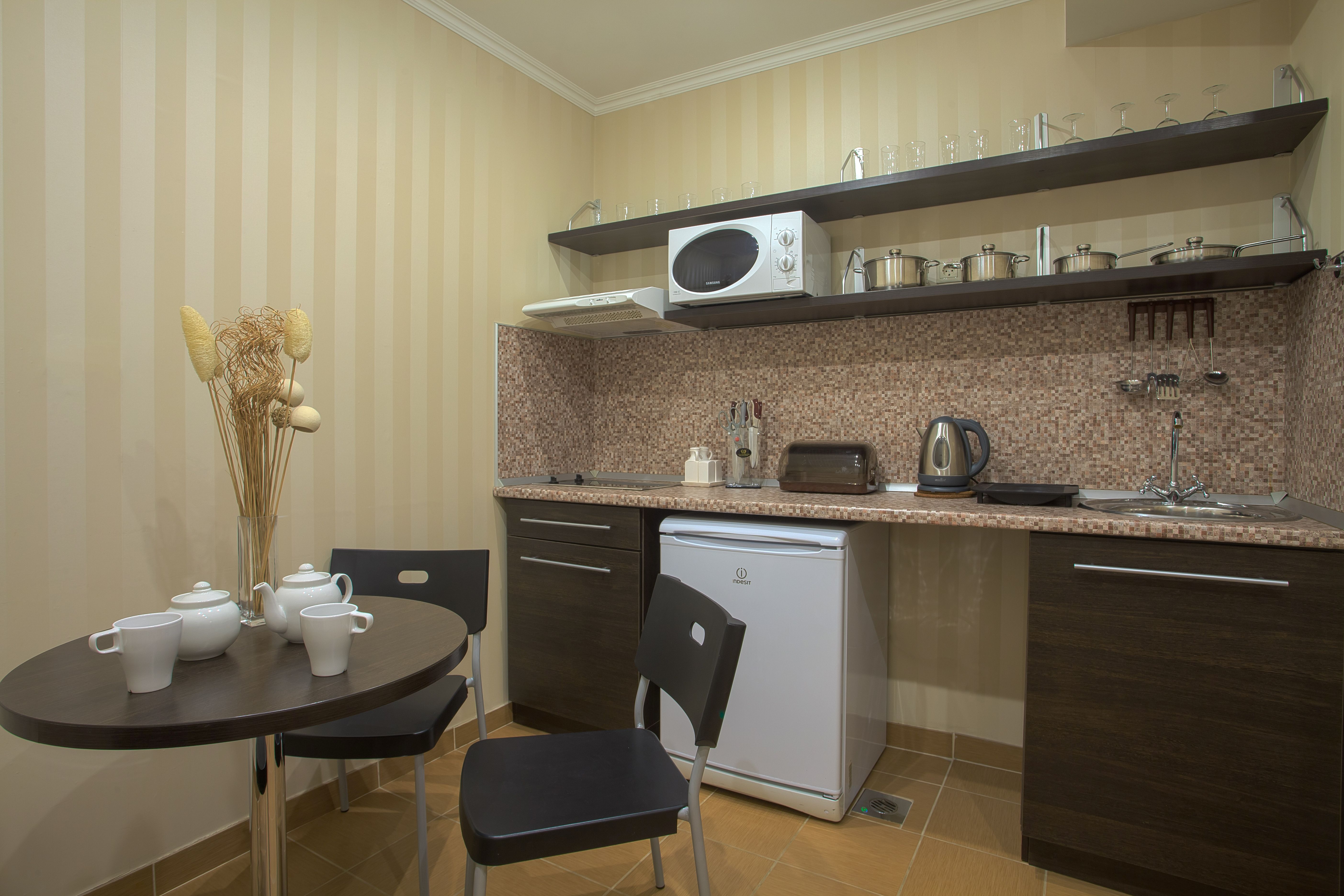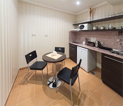 В номере: вешалка, зеркало, кровати односпальные /одна двуспальная кровать, прикроватные тумбочки, стол, стулья, шкаф, кондиционер, микроволновая печь, набор посуды, плита электрическая, сейф, телевизор, телефон, холодильник, чайный набор посуды, электрочайник