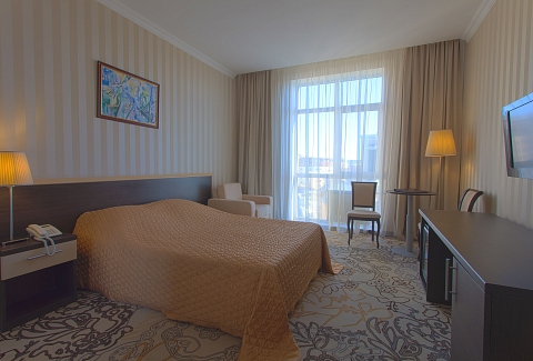В номере: вешалка, зеркало, кресла, кровать двуспальная, прикроватные тумбочки, стол, стул, шкаф, кондиционер, мини-холодильник, сейф, телевизор, телефон, чайный набор посуды, электрочайник