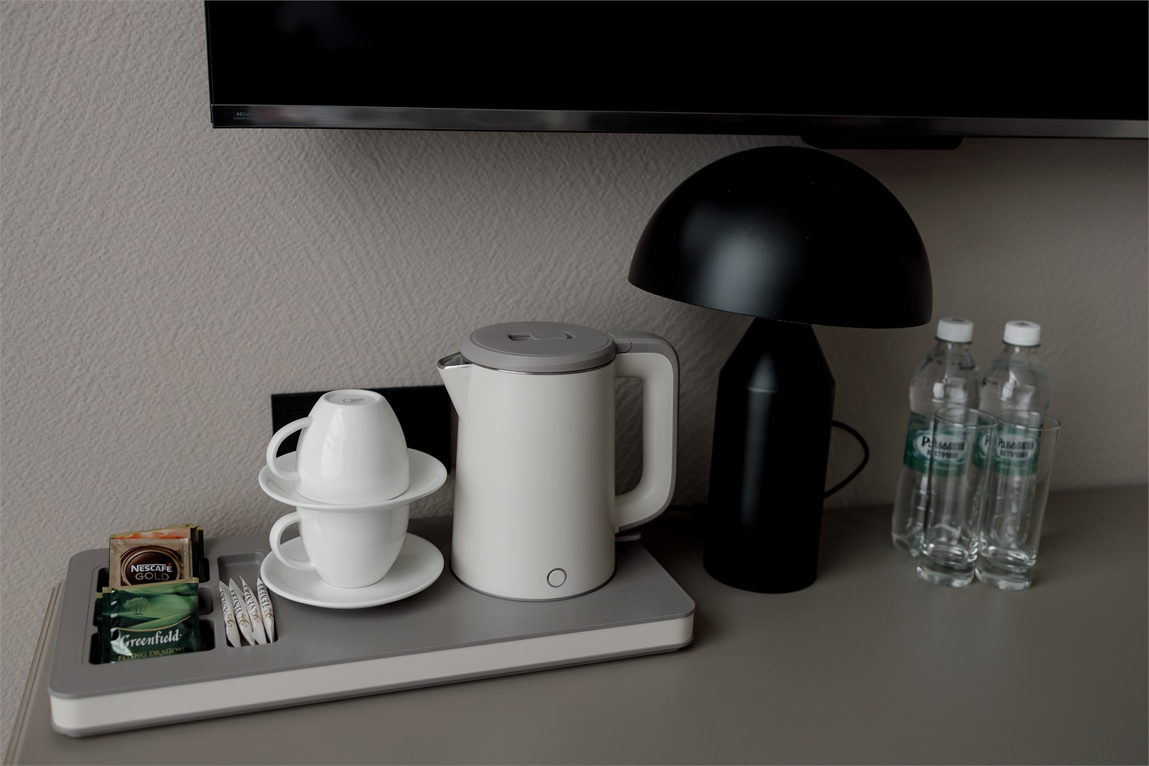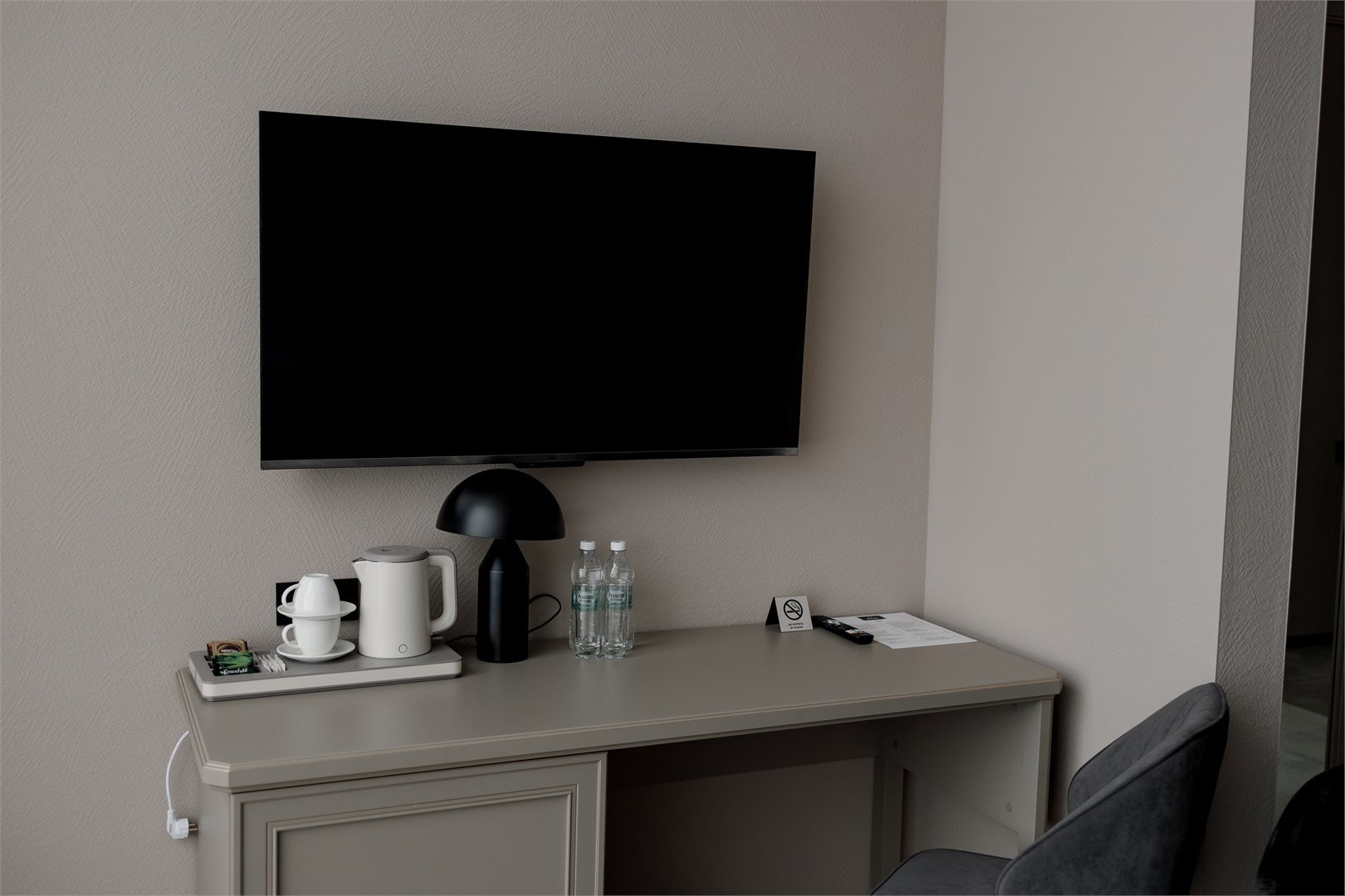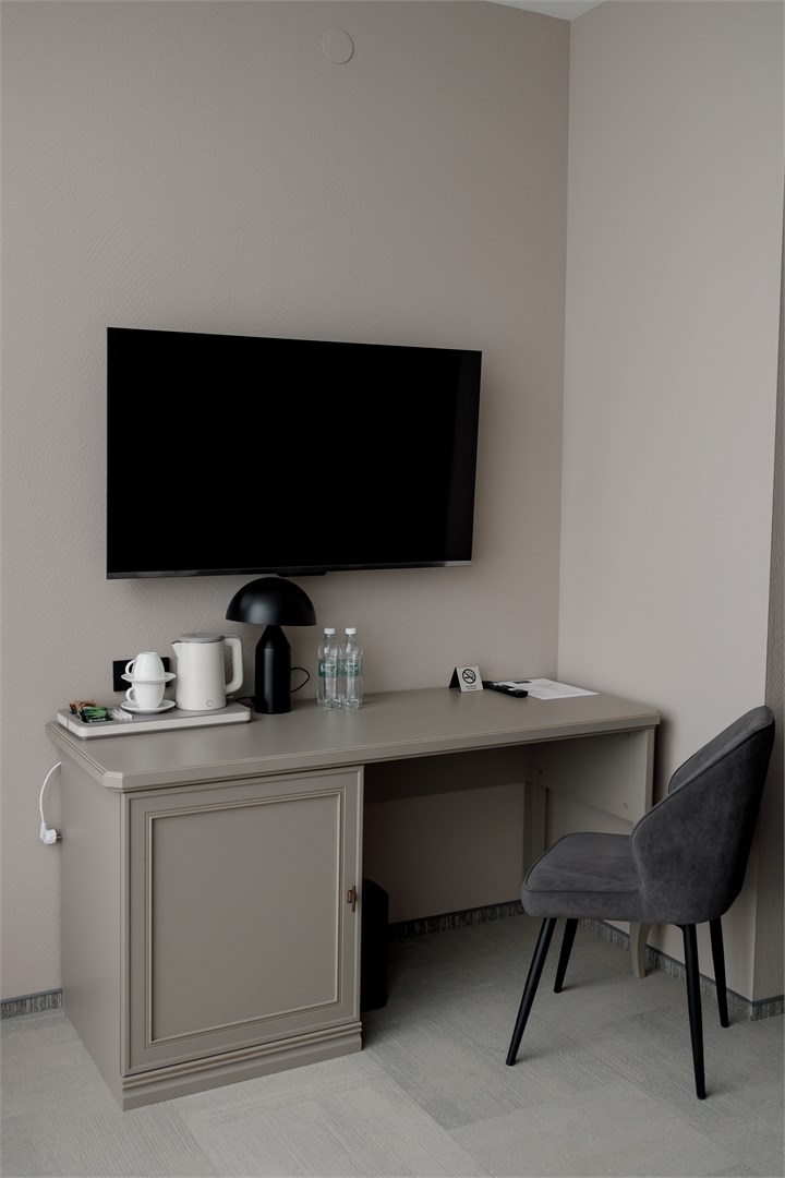 В номере: вешалка, зеркало, кровати односпальные, прикроватные тумбочки, стол, стулья, шкаф, мини-холодильник, телевизор, телефон, чайный набор посуды, электрочайник
