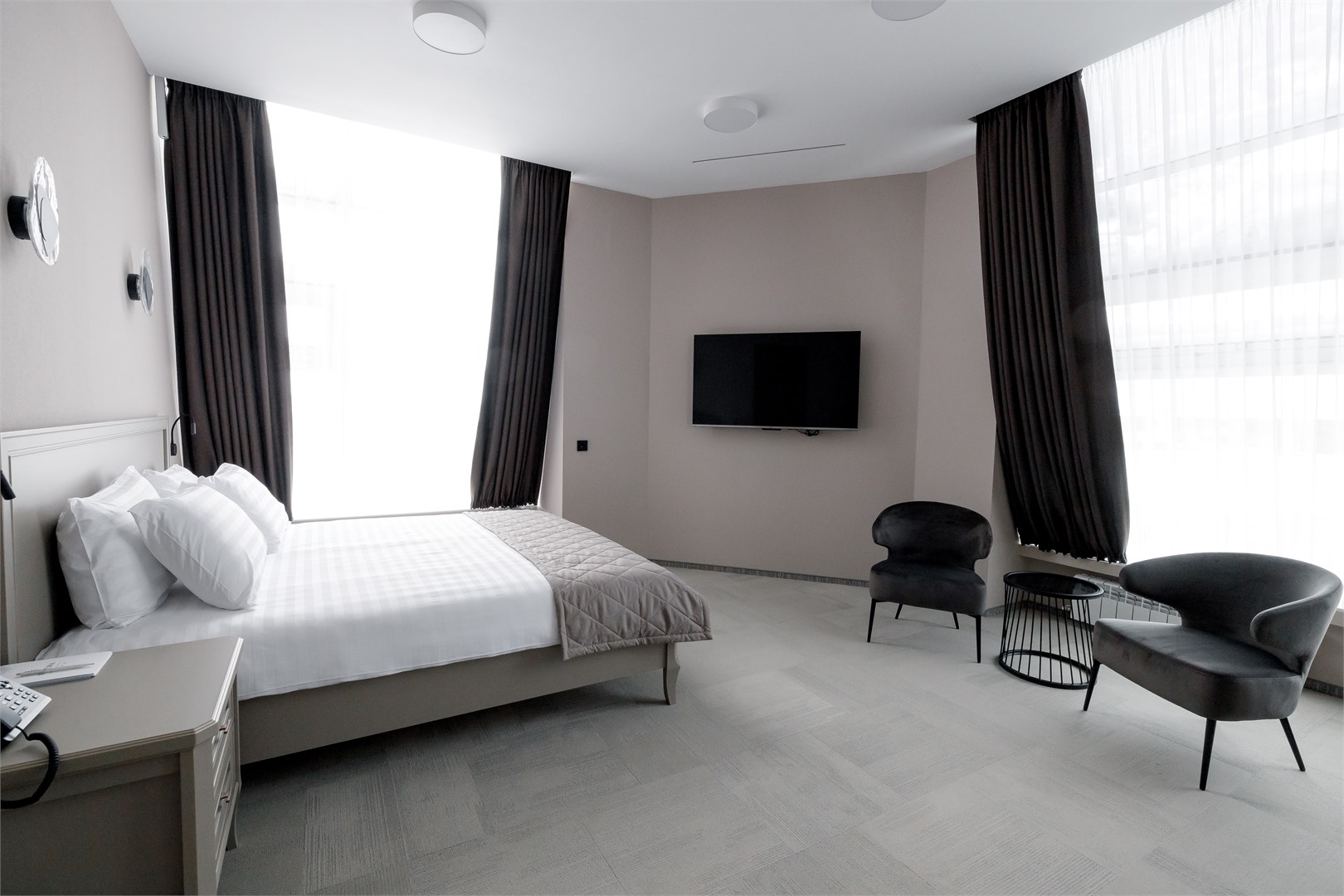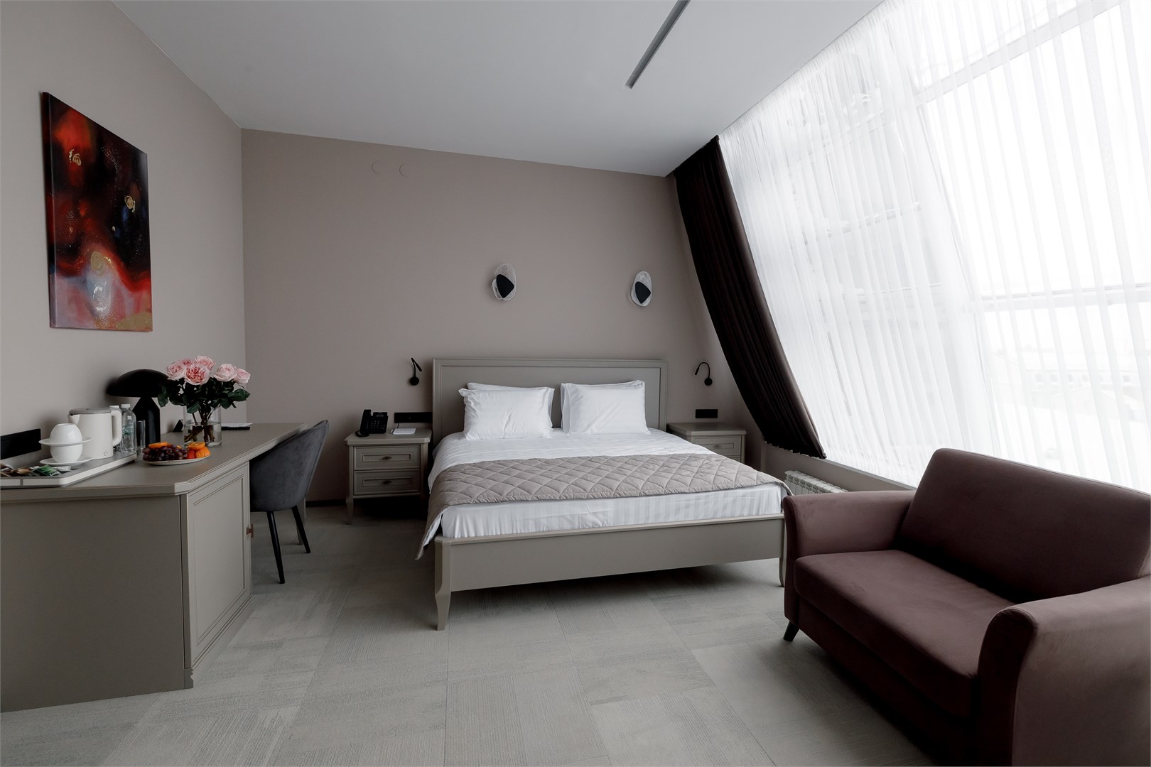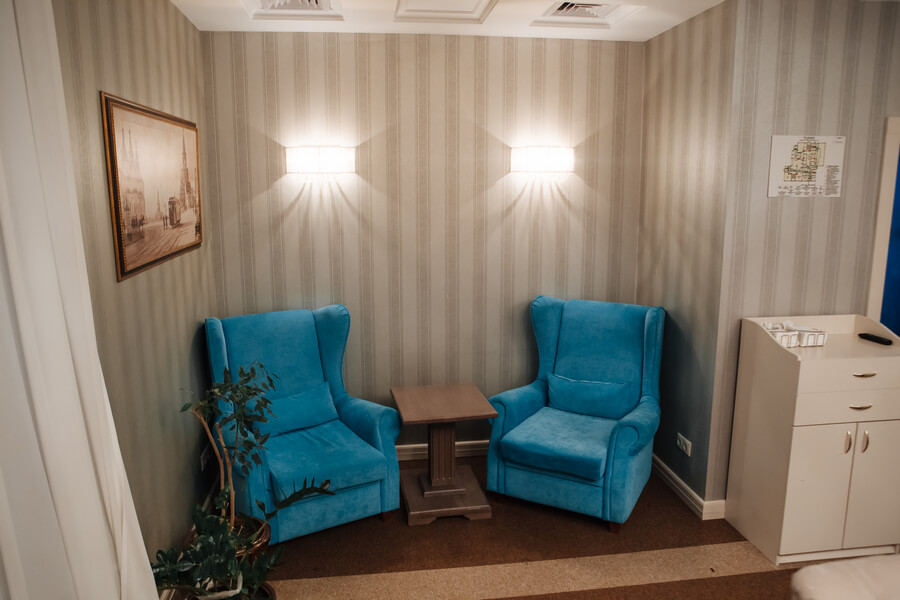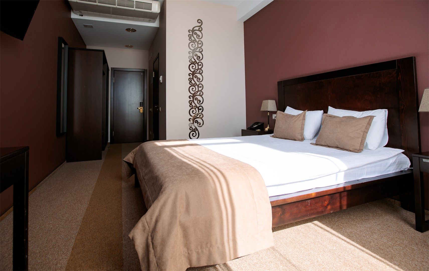 В номере: вешалка, диван, зеркало, кресло, кровать двуспальная, прикроватные тумбочки, стол, стулья, шкаф, кондиционер, мини-холодильник, сейф, телевизор, телефон, чайник