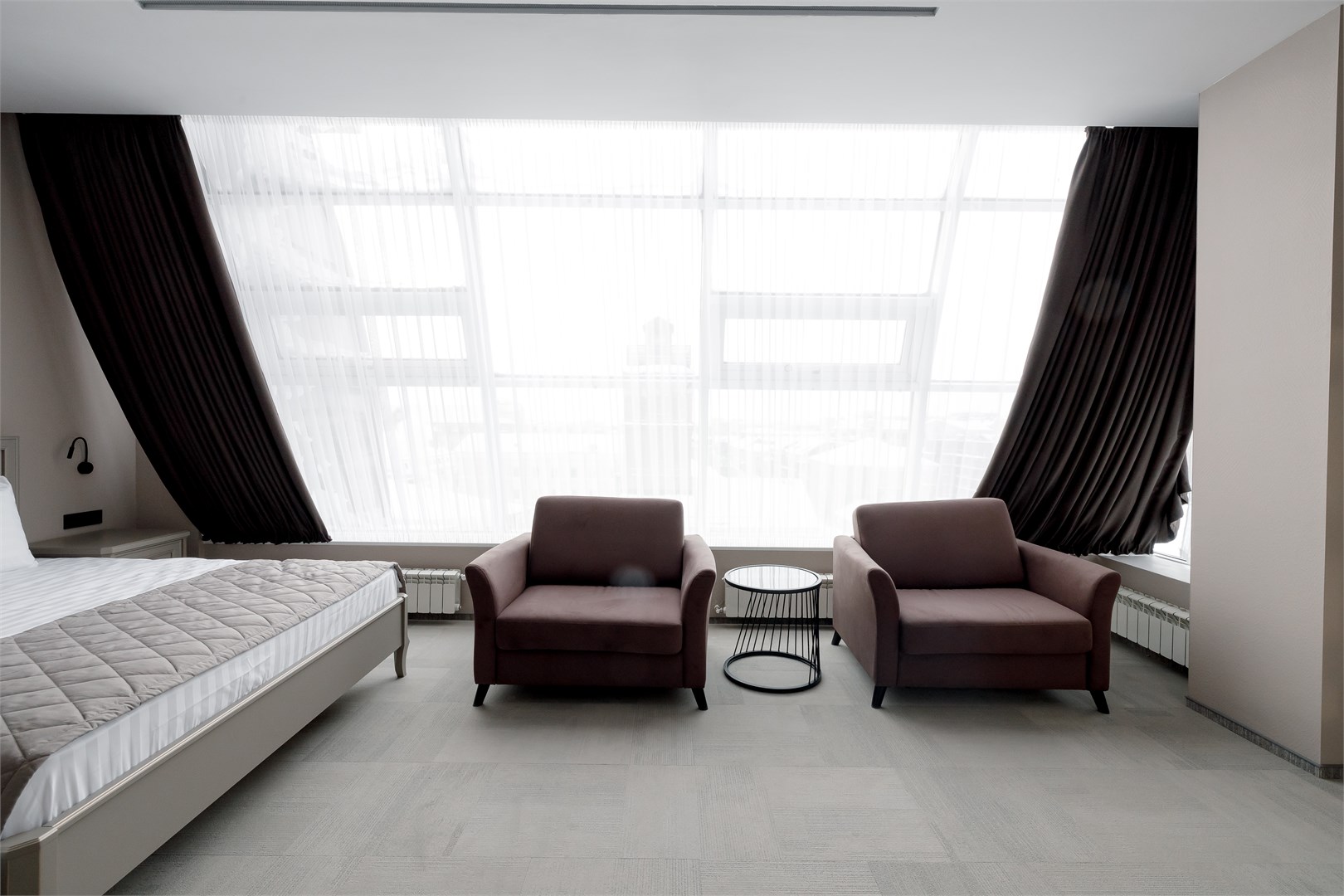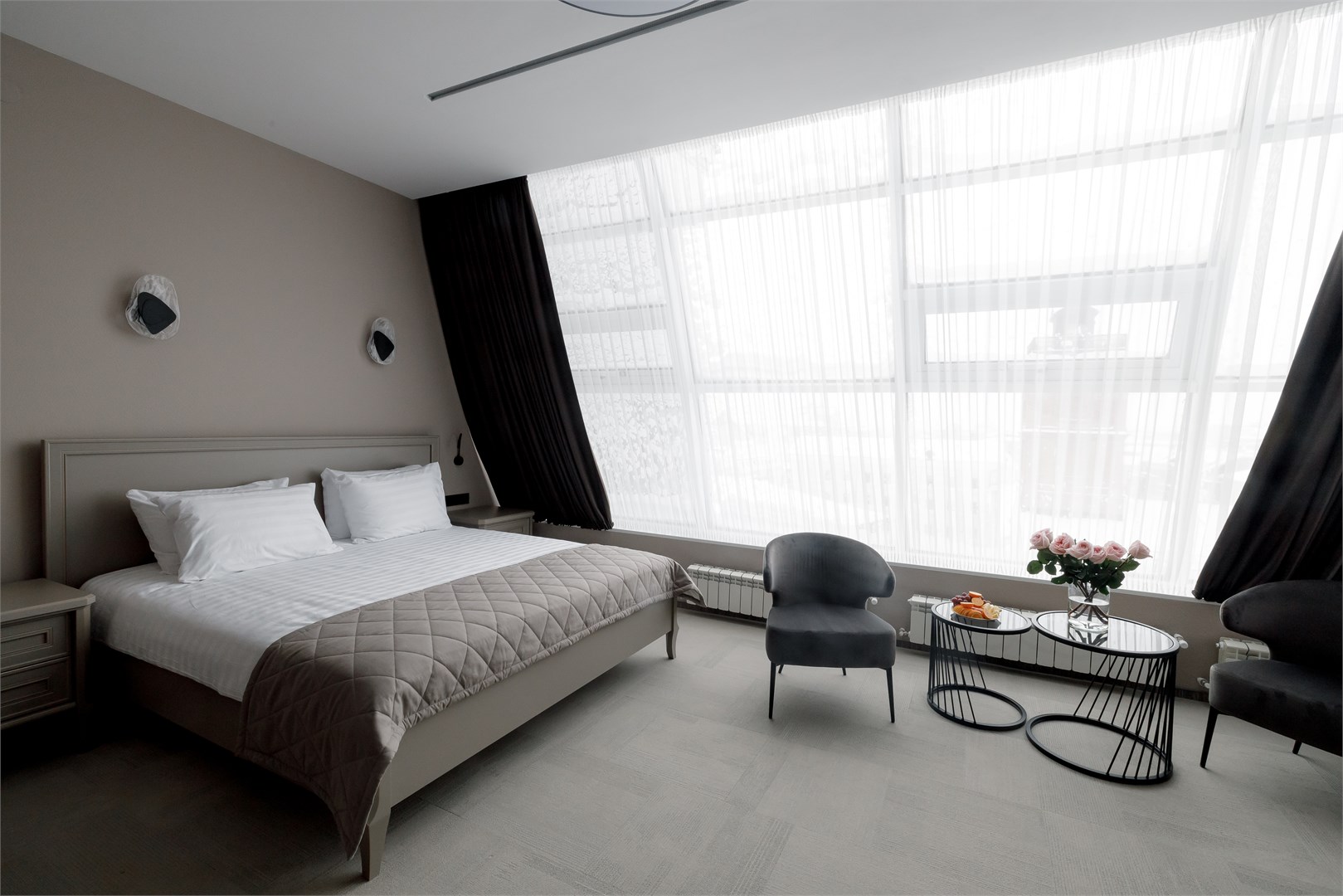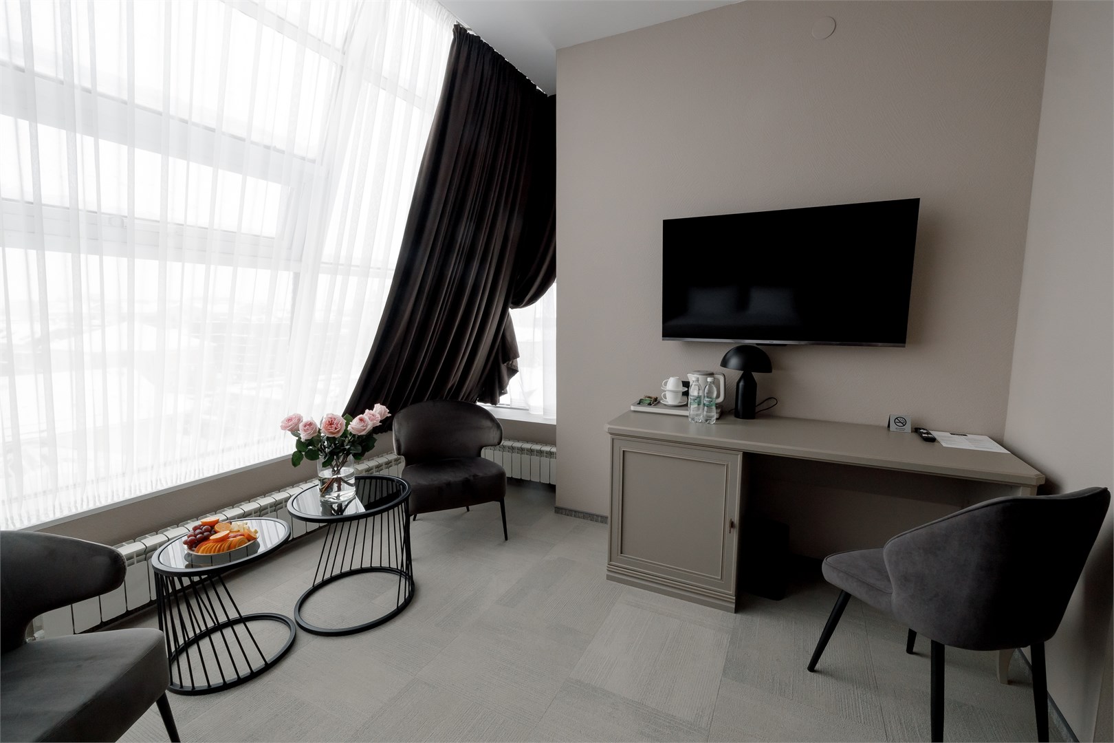 В номере: вешалка, диван, зеркало, кресло, кровать двуспальная, прикроватные тумбочки, стол, стулья, шкаф, кондиционер, мини-холодильник, сейф, телевизор, телефон, чайник