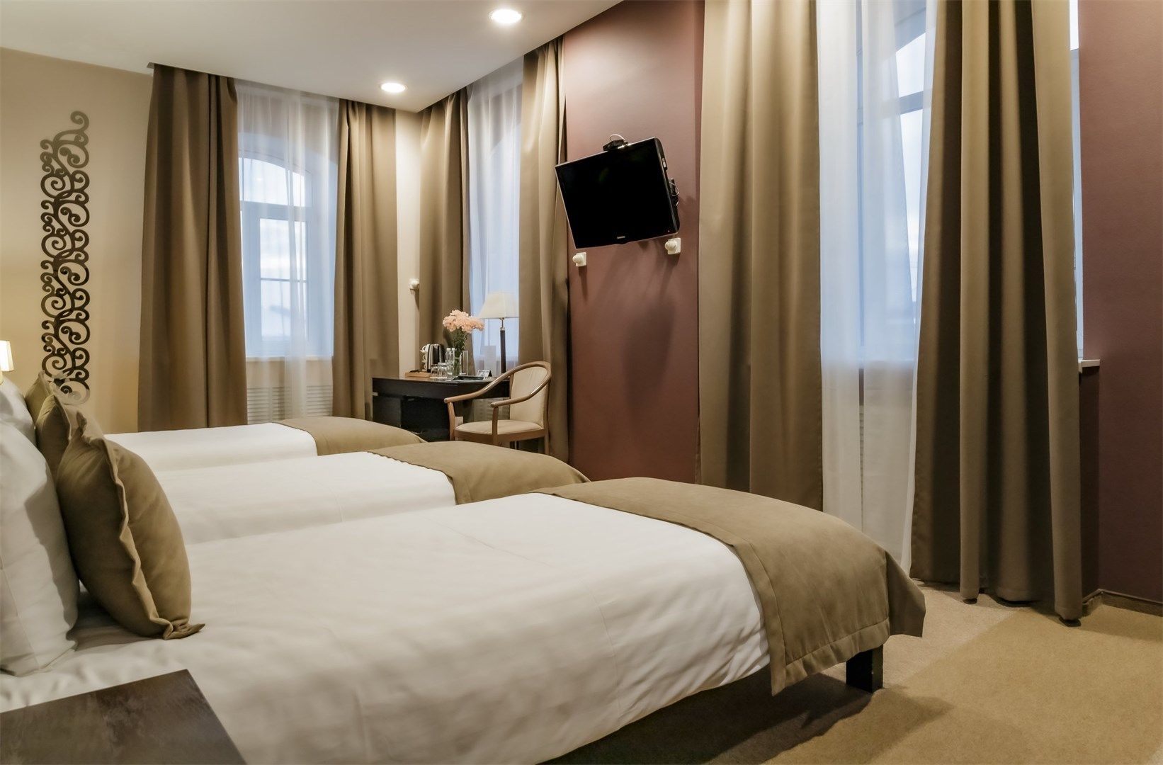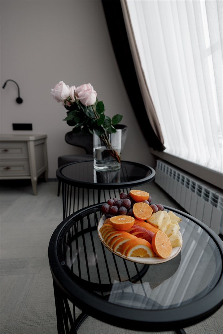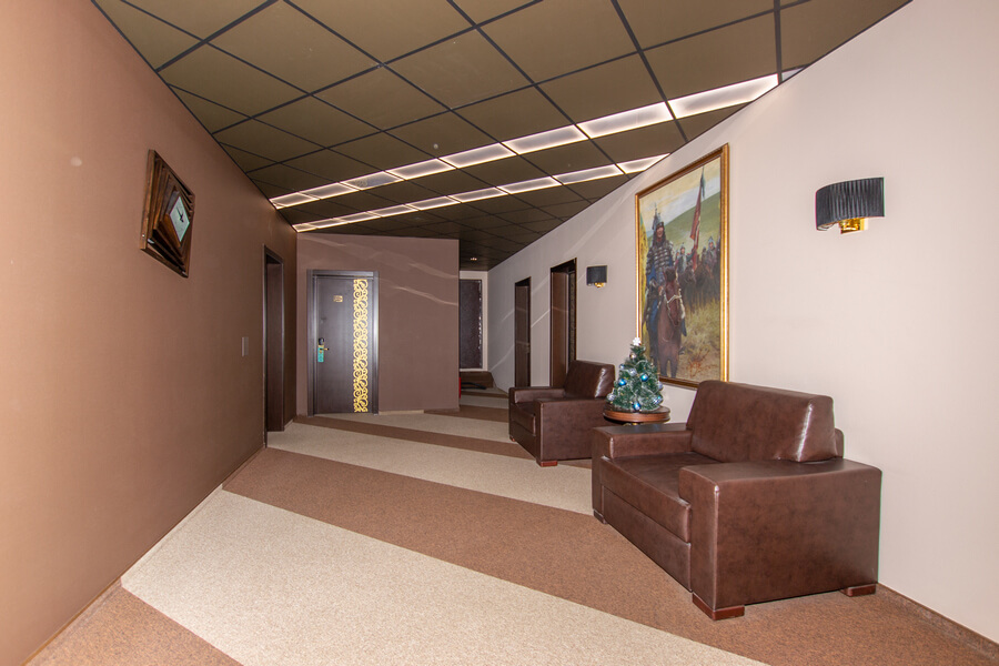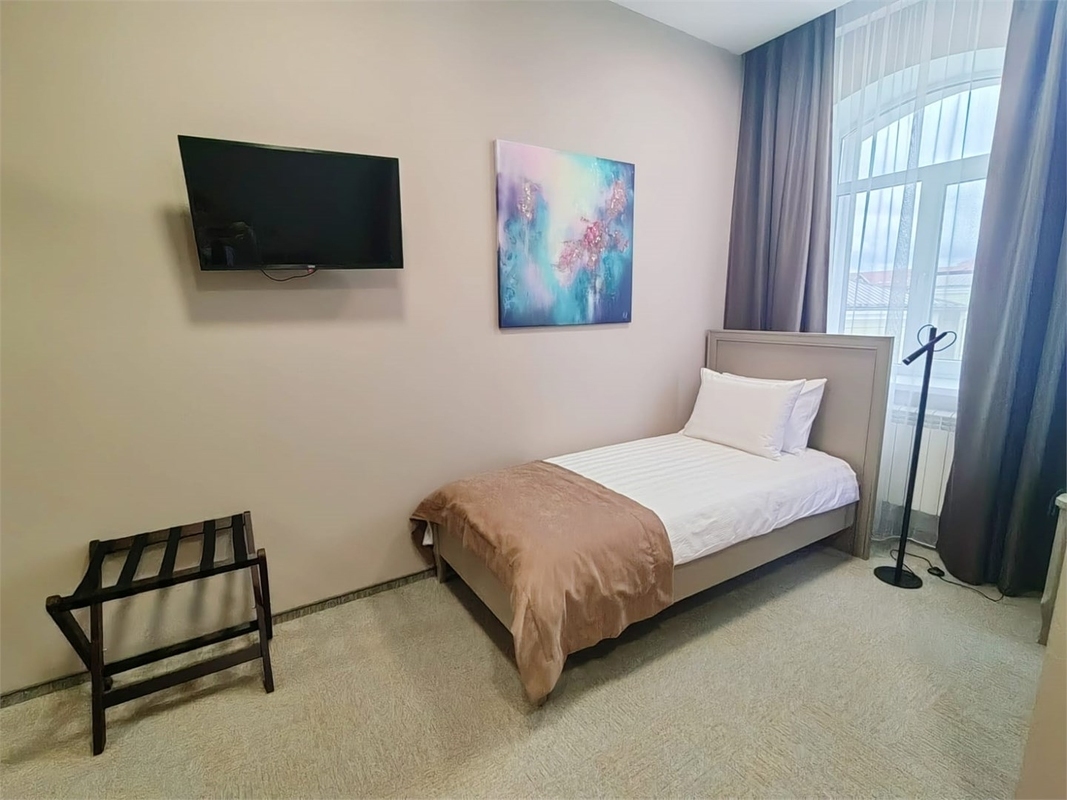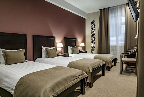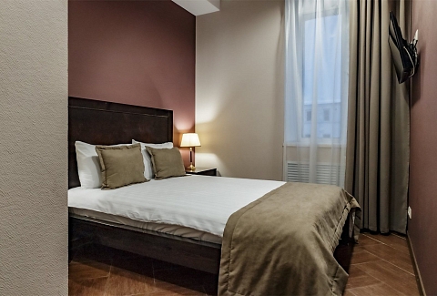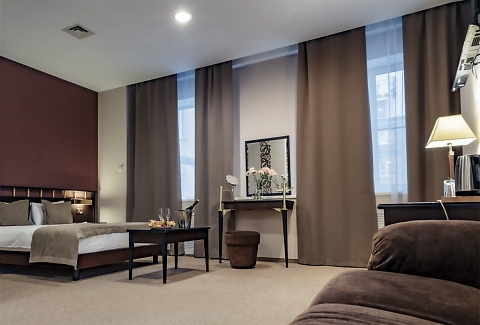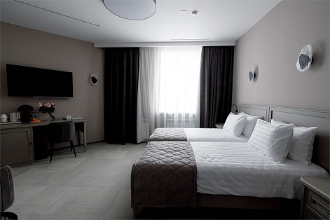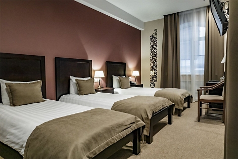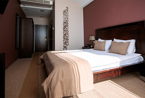 Гости могут разместиться как в бюджетных номерах, так и выбрать варианты улучшенной категории. В комнатах приятный классический интерьер, во всех номерах независимо от уровня комфорта имеется индивидуальный санузел с душем, кондиционер, телевизор, фен. В отеле работает ресторан европейской кухни, где отдыхающие могут заказать себе завтраки, обеды, ужины. В распоряжении отдыхающие сауна, спортивный и тренажерный залы, также всем доступен беспроводной интернет, а для автовладельцев предусмотрена охраняемая парковка. При необходимости детям администрация отеля предоставляет кроватки-манежи.