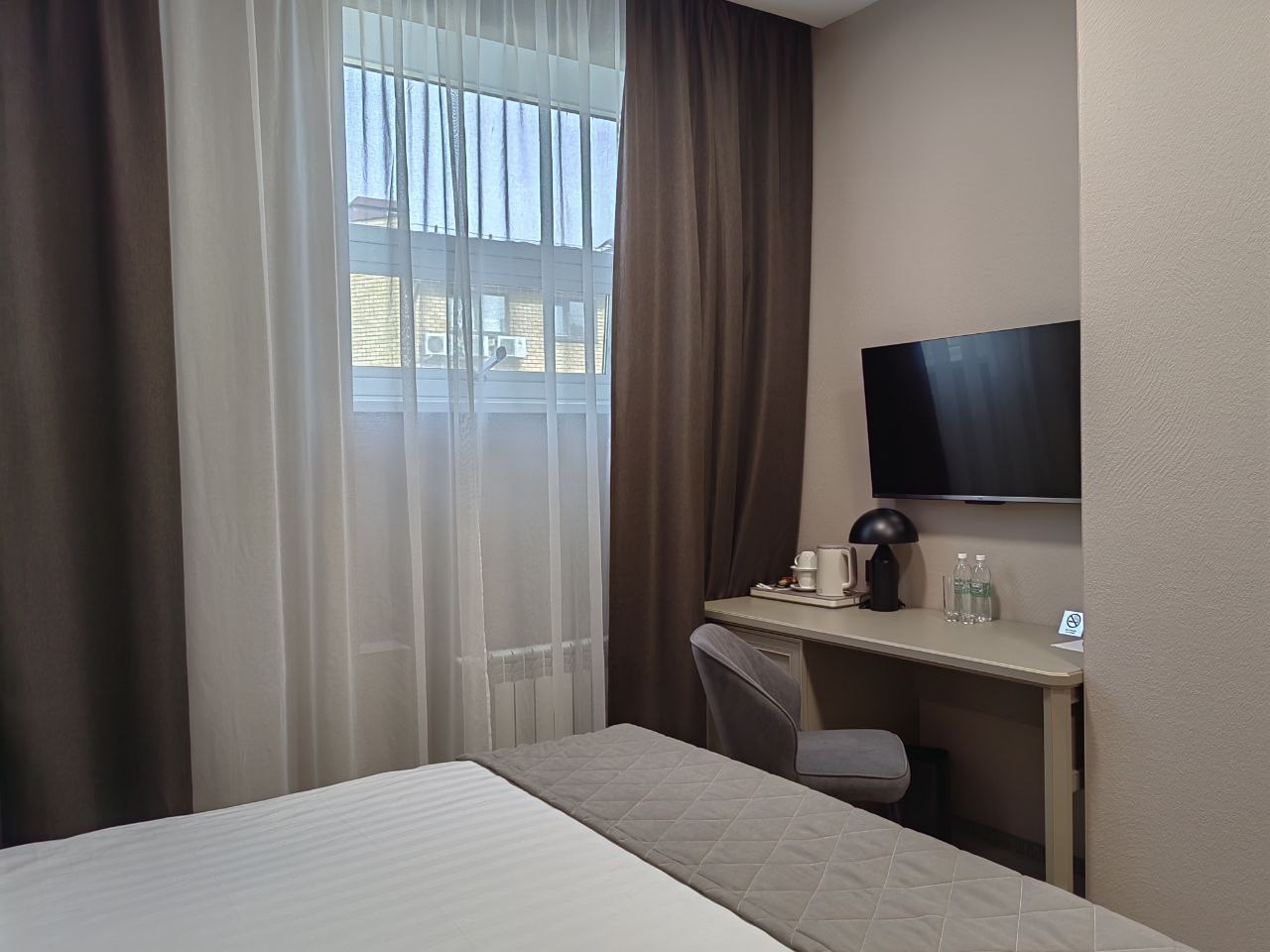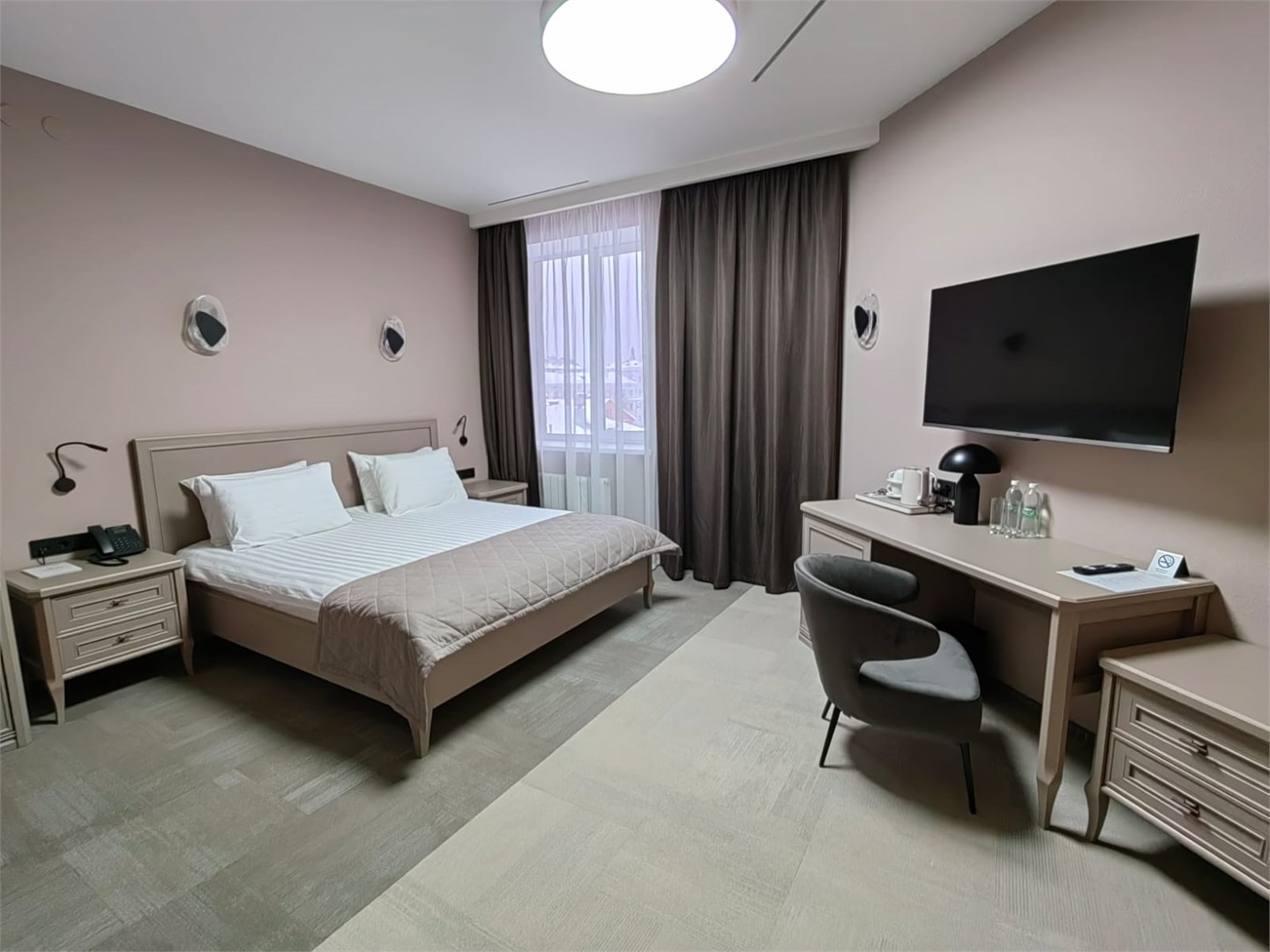 В номере: вешалка, зеркало, кровать двуспальная, прикроватные тумбочки, стол, стул, шкаф, кондиционер, мини-холодильник, сейф, телевизор, телефон