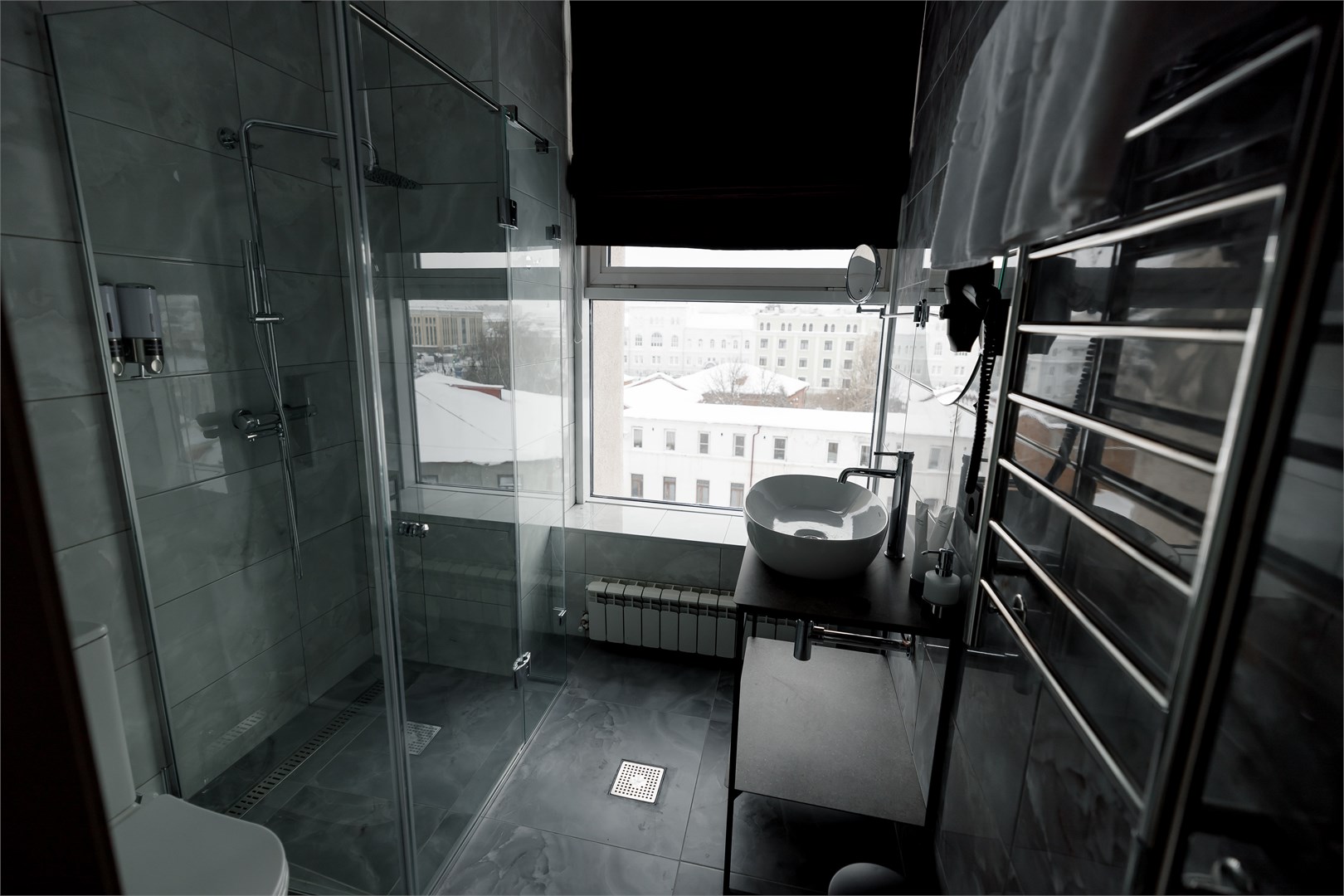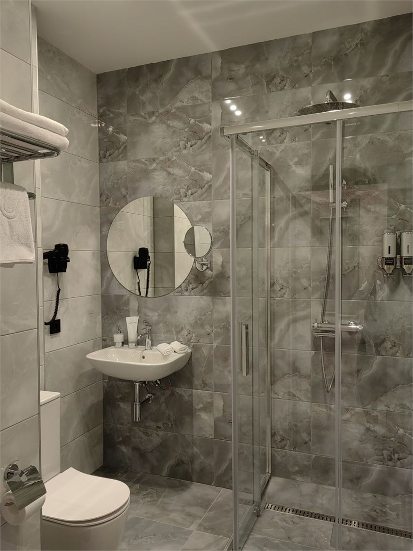Санузел: с душевой кабиной, тапочки, туалетные принадлежности, фен