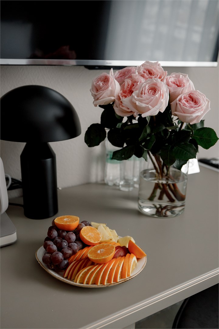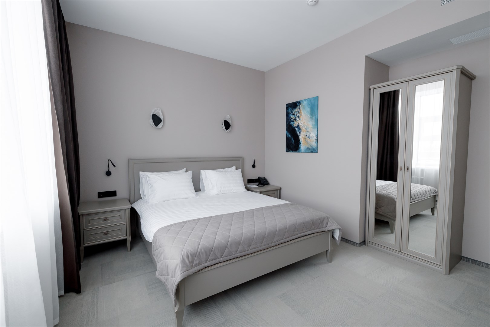 В номере: вешалка, диван, зеркало, кровать двуспальная, прикроватные тумбочки, стол, стул, шкаф, кондиционер, мини-холодильник, сейф, телевизор, телефон
