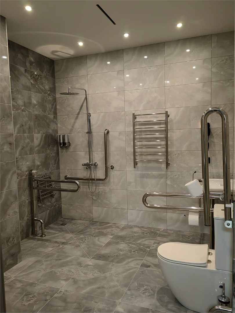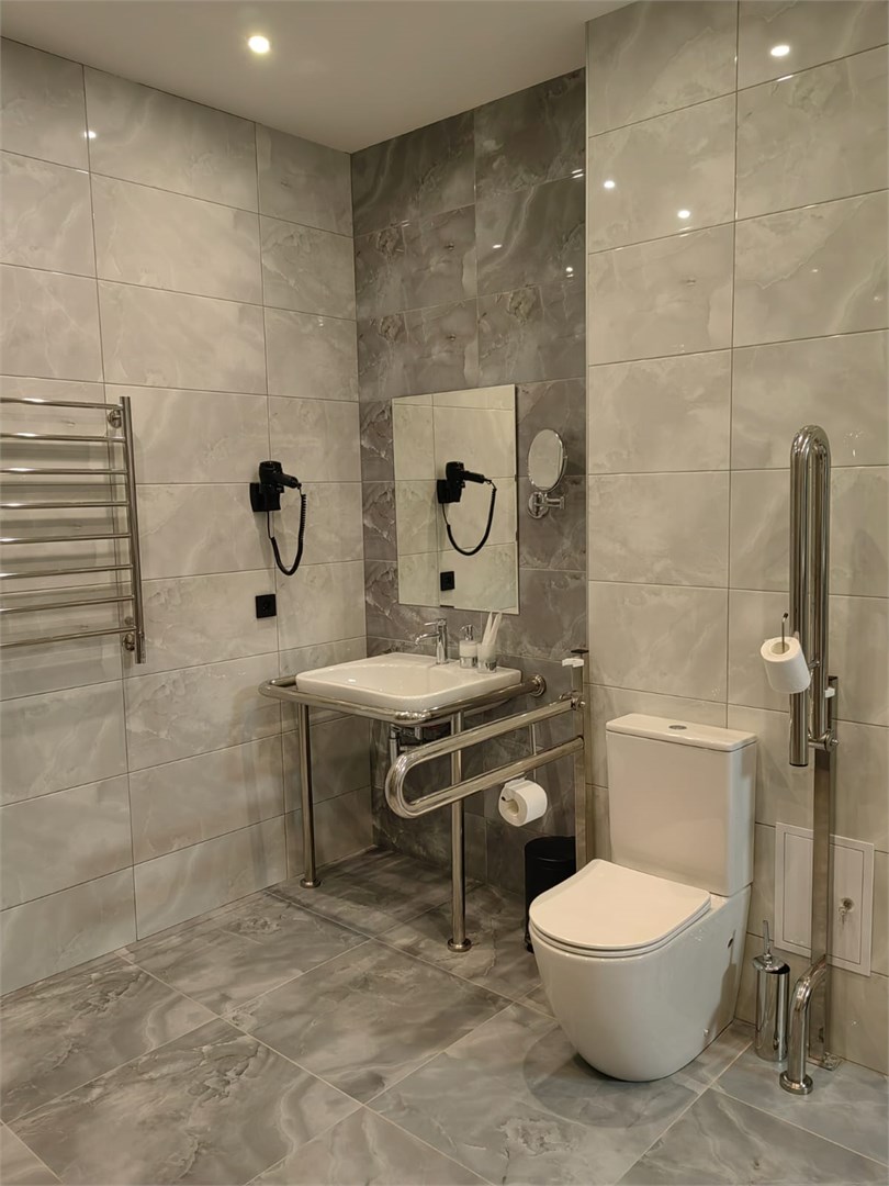 Санузел: с душем или ванной, тапочки, туалетные принадлежности, фен, халат