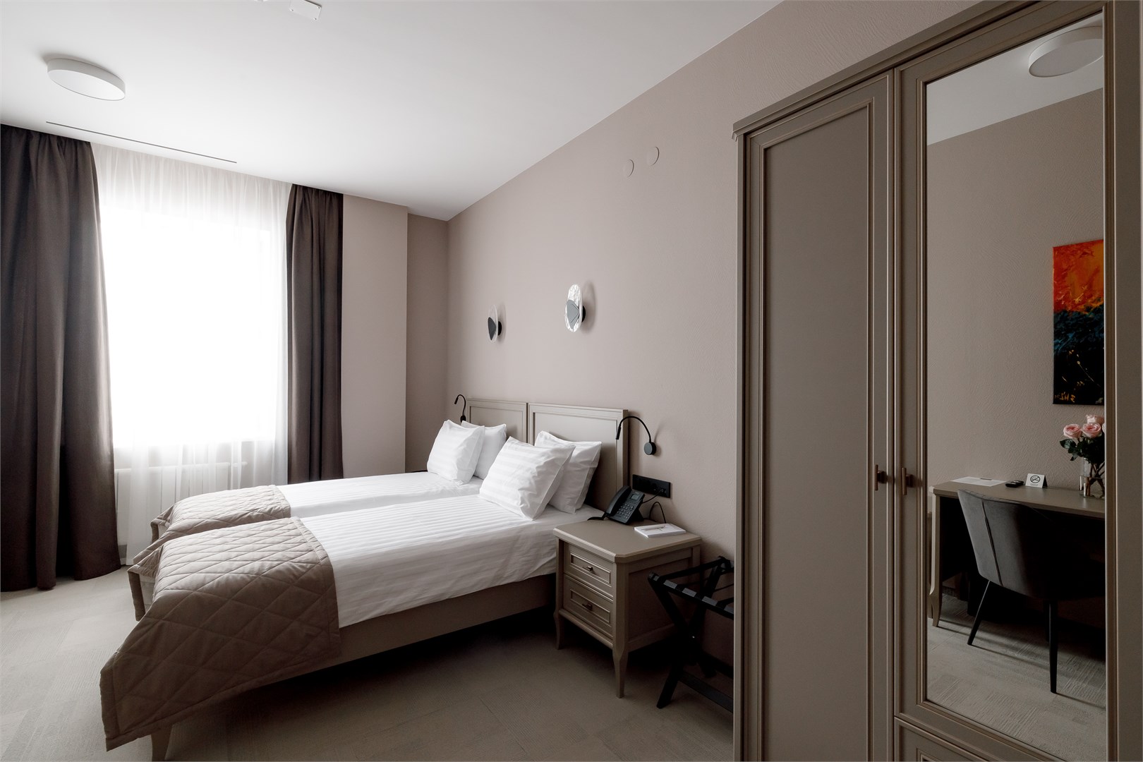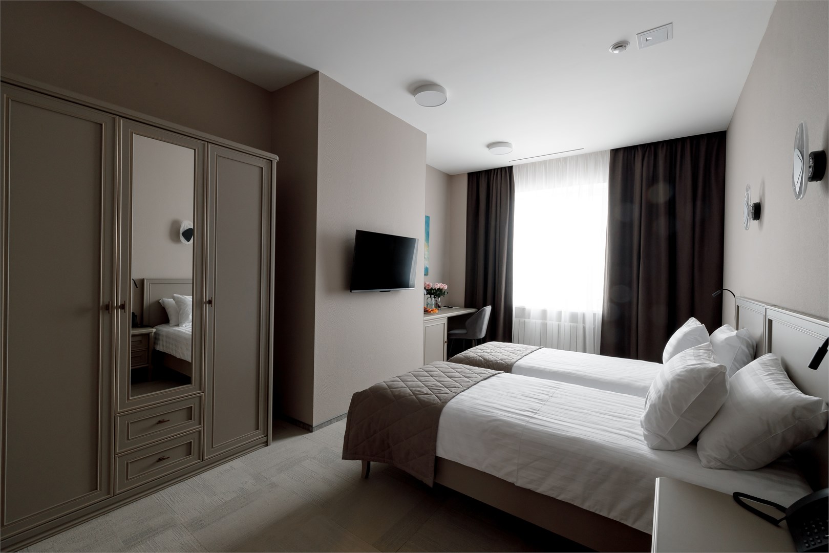 В номере: вешалка, зеркало, кровати односпальные, прикроватные тумбочки, стол, стулья, шкаф, кондиционер, мини-холодильник, сейф, телевизор, телефон