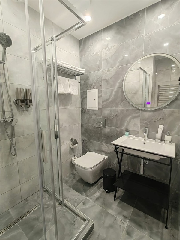 Санузел: с душевой кабиной, тапочки, туалетные принадлежности, фен, халат
