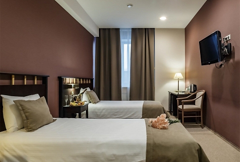 В номере: вешалка, зеркало, кровати односпальные, прикроватные тумбочки, стол, стул, шкаф, кондиционер, мини-холодильник, сейф, телевизор, телефон