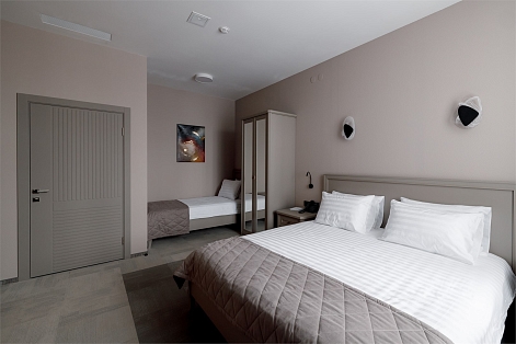 В номере: кровать двуспальная, кровать односпальная, прикроватные тумбочки, стол, стулья, шкаф, кондиционер, мини-холодильник, сейф, телевизор, телефон, чайная станция