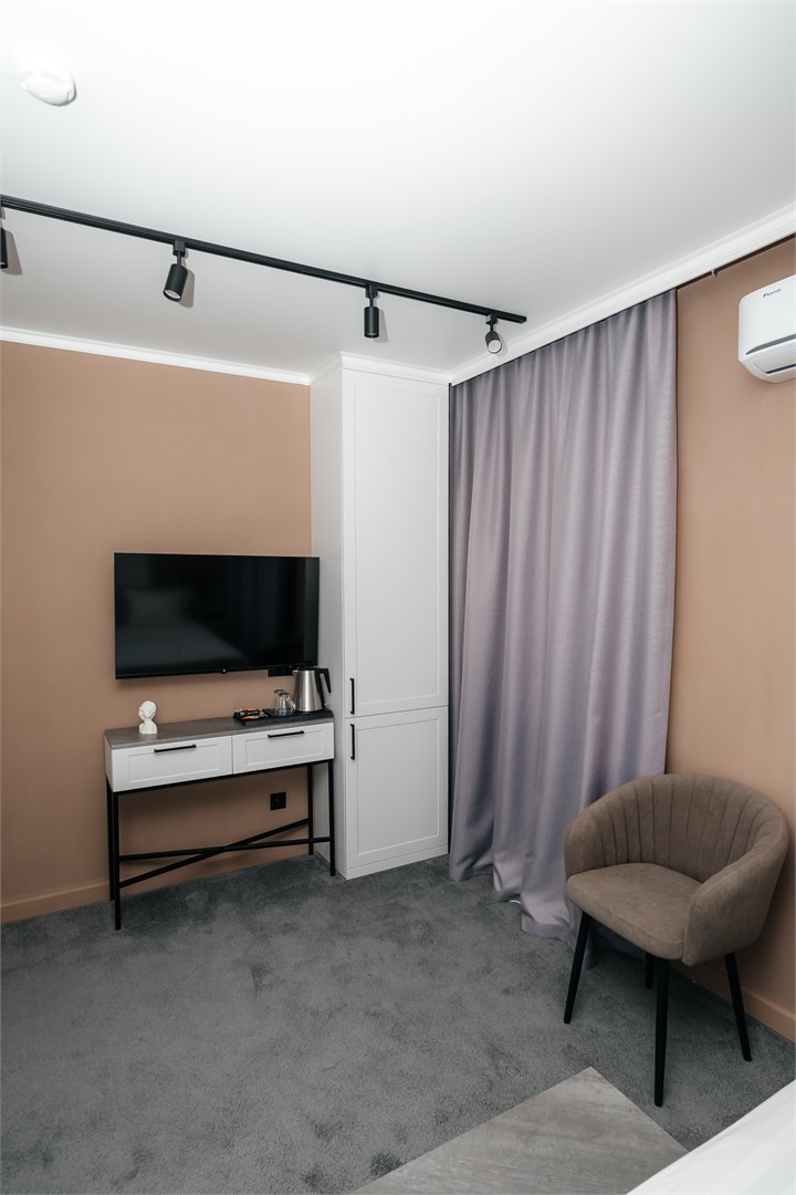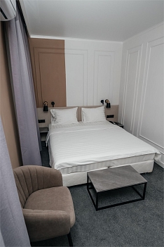 В номере: кресло, кровать двуспальная, прикроватные столики, стол, шкаф, кондиционер, телевизор, телефон, чайная станция
