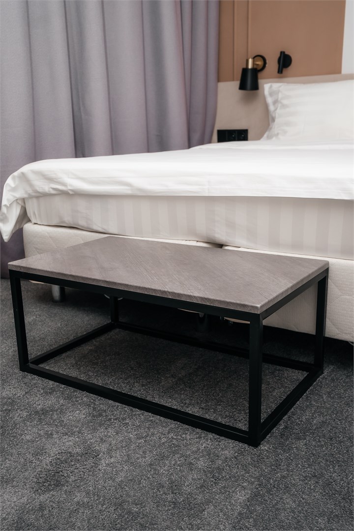 В номере: кресло, кровать двуспальная, прикроватные тумбочки, стол, кондиционер, телевизор, телефон, чайная станция