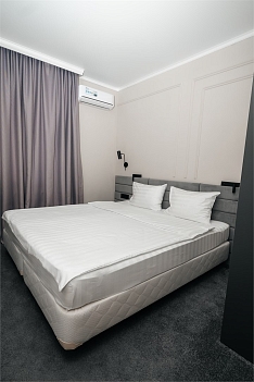 В номере: кровать двуспальная, прикроватные столики, стол, шкаф, кондиционер, телевизор, телефон, чайная станция