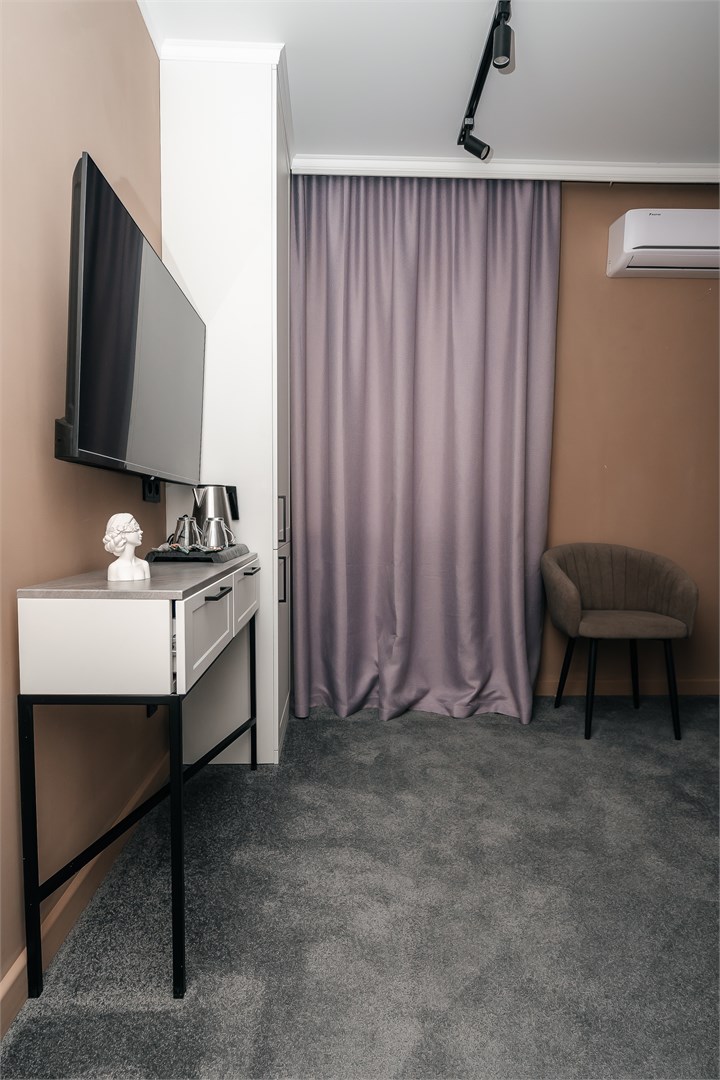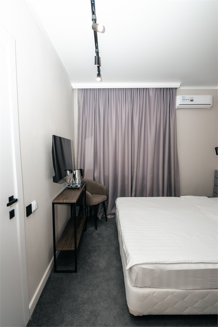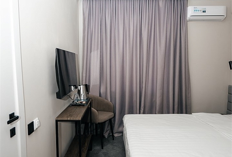 В номере: кровать двуспальная, прикроватные столики, стол, шкаф, кондиционер, телевизор, телефон, чайная станция