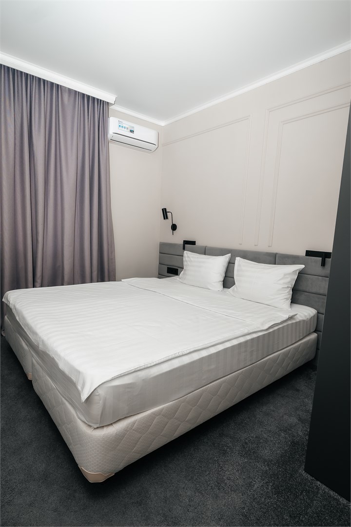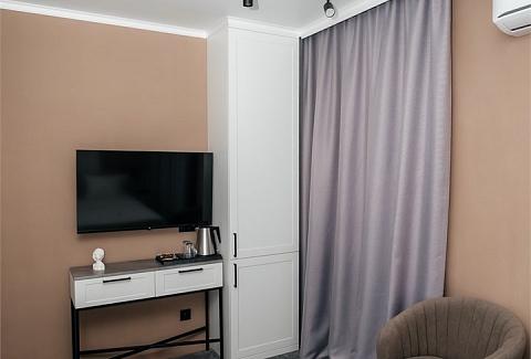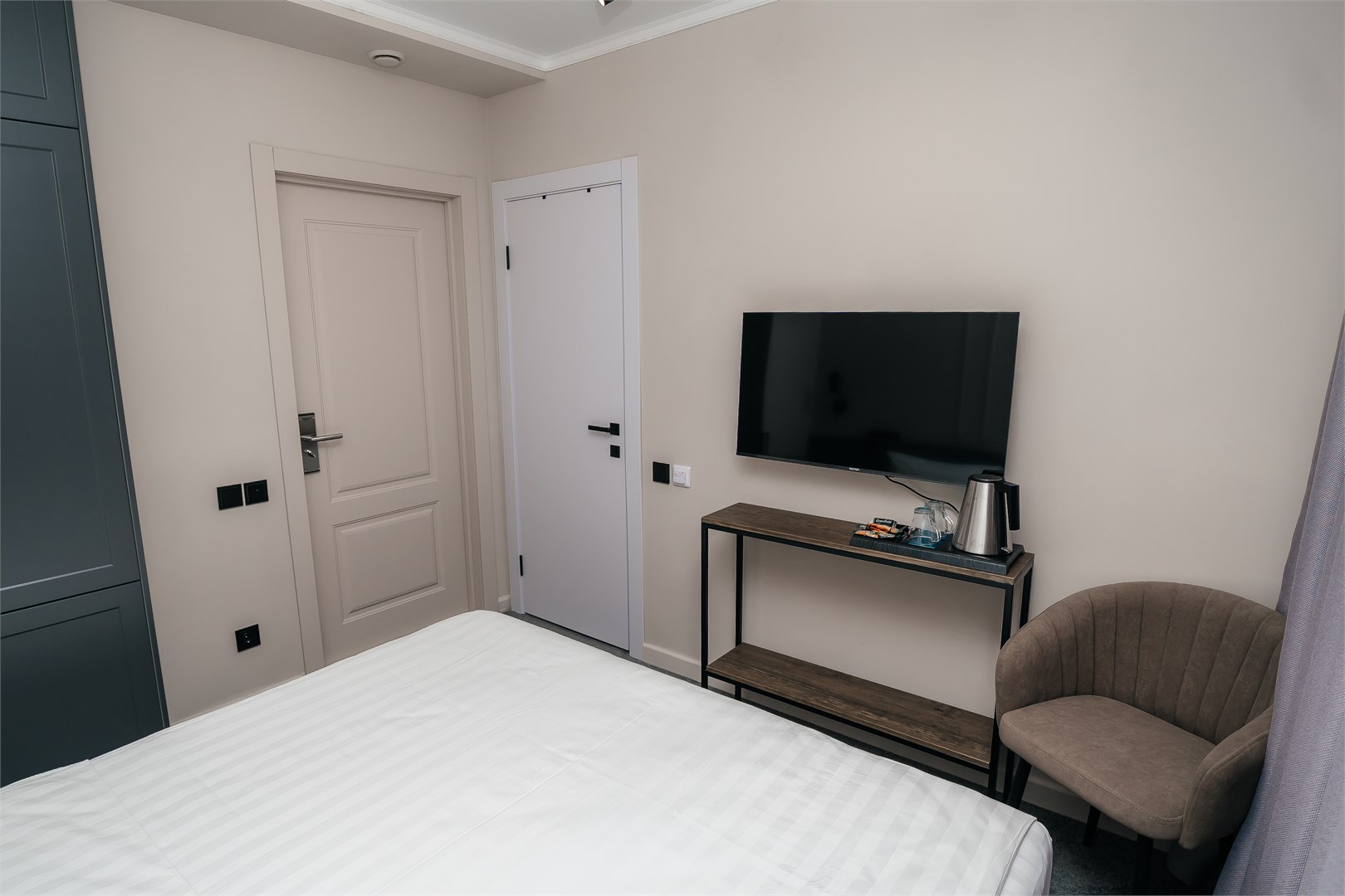 В номере: кресло, кровать двуспальная, прикроватные столики, стол, шкаф, кондиционер, телевизор, телефон, чайная станция