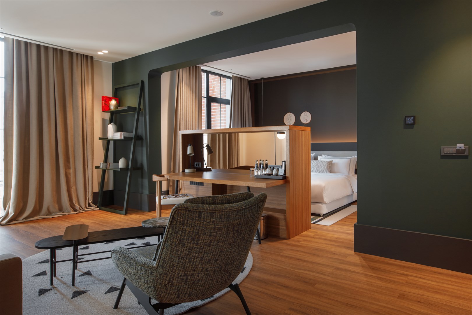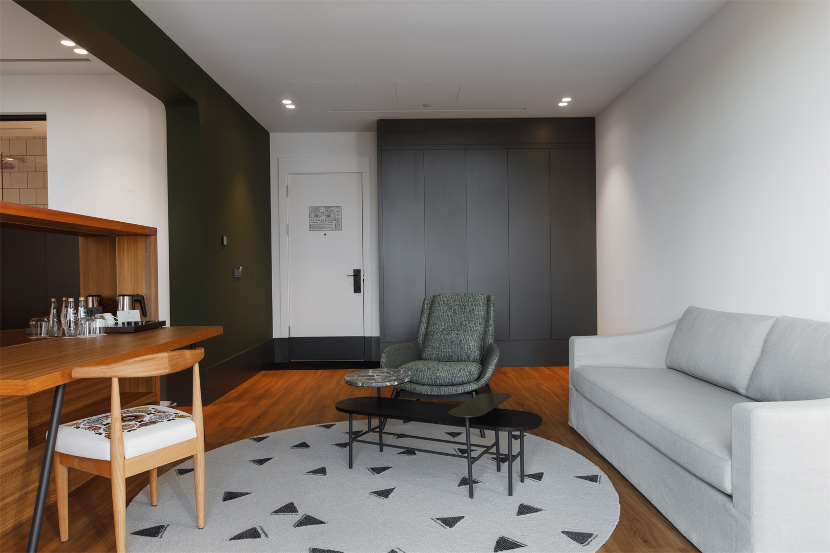 В номере: кровать двуспальная, прикроватные тумбочки, стол, стулья, шкаф, гладильная доска, кондиционер, набор посуды, сейф, телевизор, телефон, утюг, чайная станция