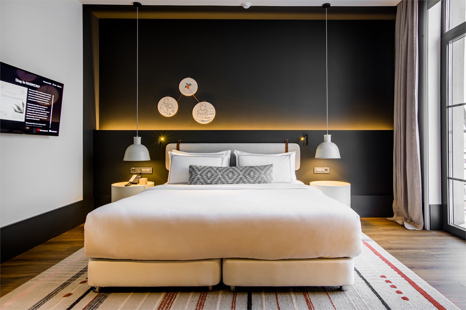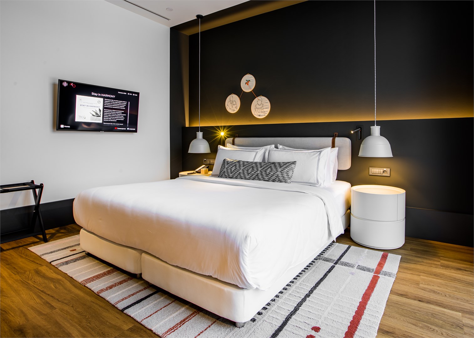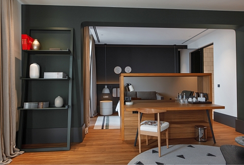 В номере: кровать двуспальная, прикроватные тумбочки, стол, стулья, шкаф, гладильная доска, кондиционер, сейф, телевизор, телефон, утюг, чайная станция