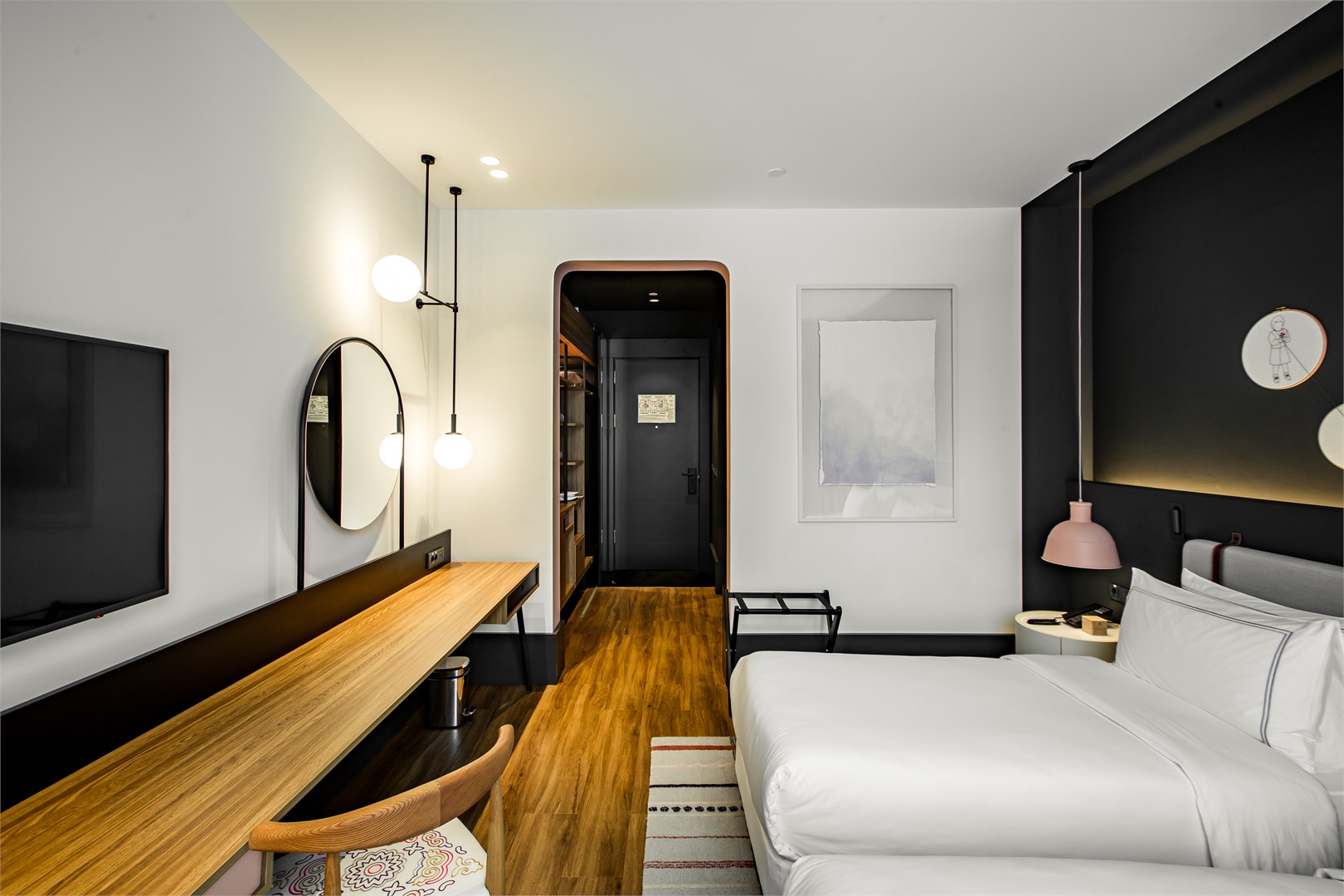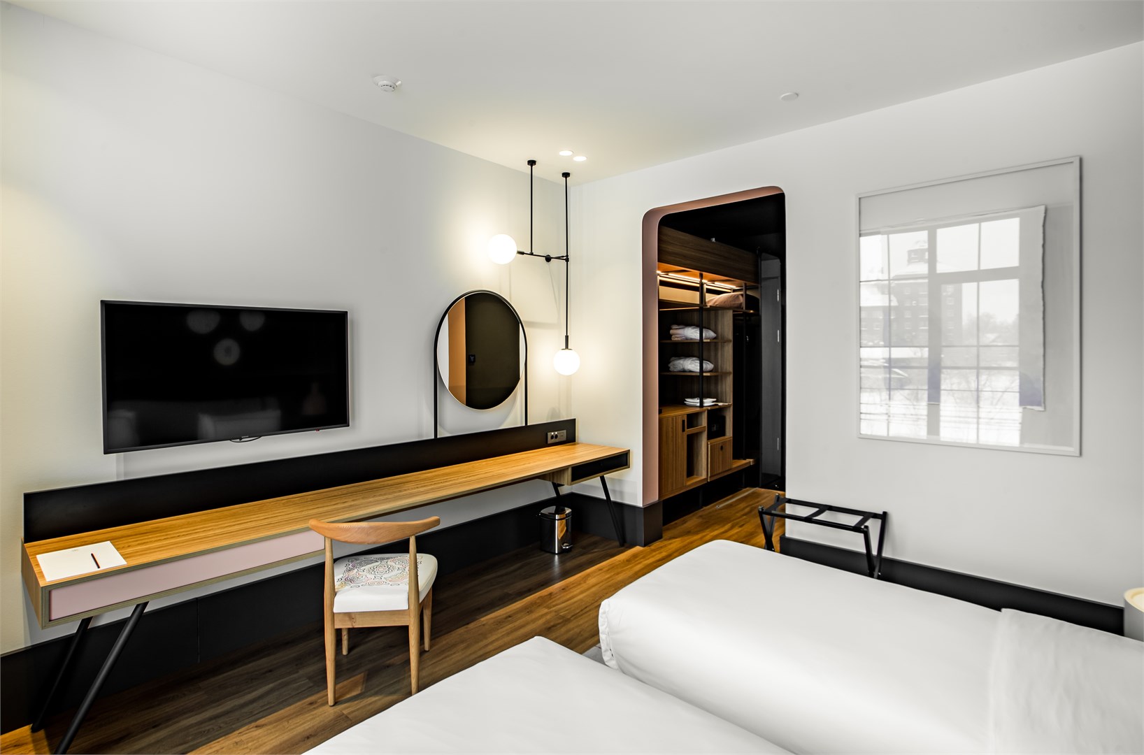 В номере: вешалка, зеркало, кровати односпальные /одна двуспальная кровать, прикроватные тумбочки, стол, стул, шкаф, гладильная доска, мини-холодильник, сейф, сплит-система, телевизор ЖК, телефон, утюг, чайный набор посуды, электрочайник