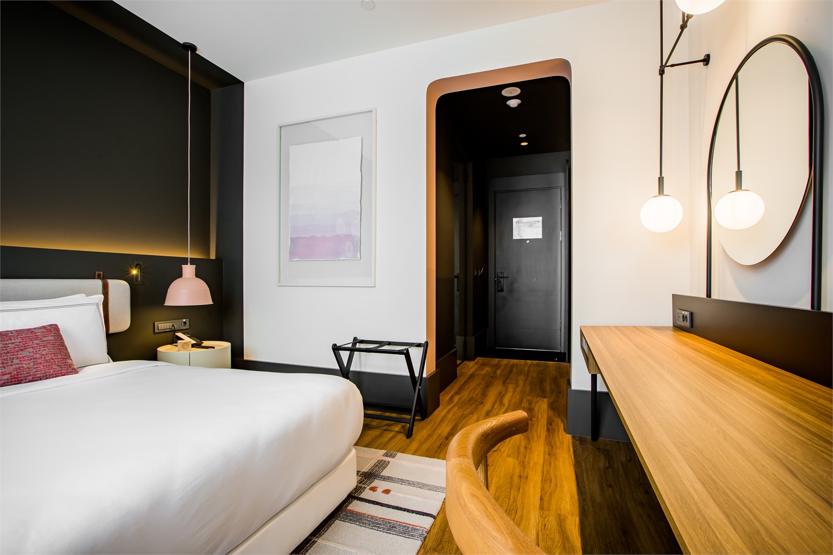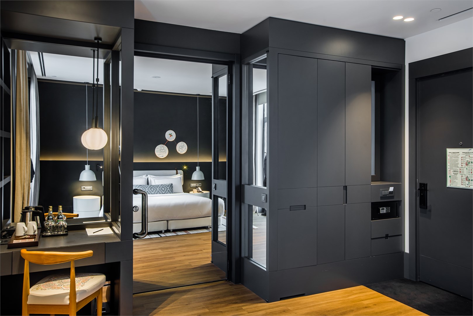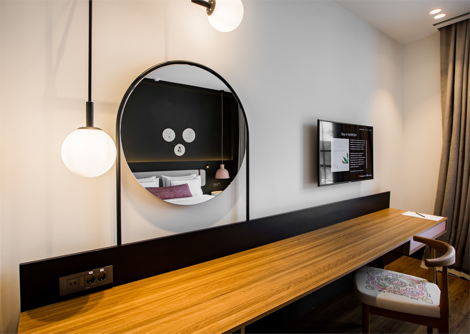 В номере: вешалка, зеркало, кровать двуспальная, прикроватные тумбочки, стол, стул, шкаф, гладильная доска, мини-холодильник, сейф, сплит-система, телевизор ЖК, телефон, утюг, чайный набор посуды, электрочайник