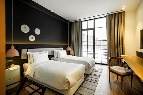 В номере: кровати односпальные, прикроватные тумбочки, стол, стулья, шкаф, гладильная доска, кондиционер, сейф, телевизор, телефон, утюг, чайная станция