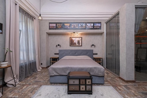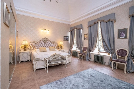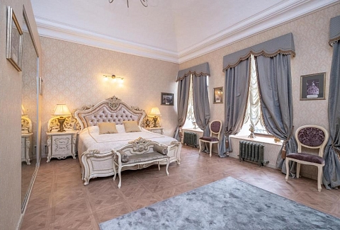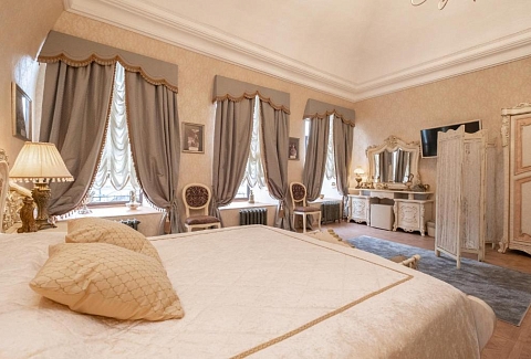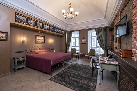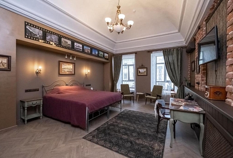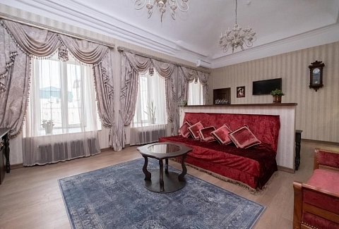 В номере: вешалка, диван, зеркало, кровать двуспальная, прикроватные тумбочки, стол, стулья, шкаф, кондиционер, мини-холодильник, сейф, телевизор ЖК, чайный набор посуды, электрочайник